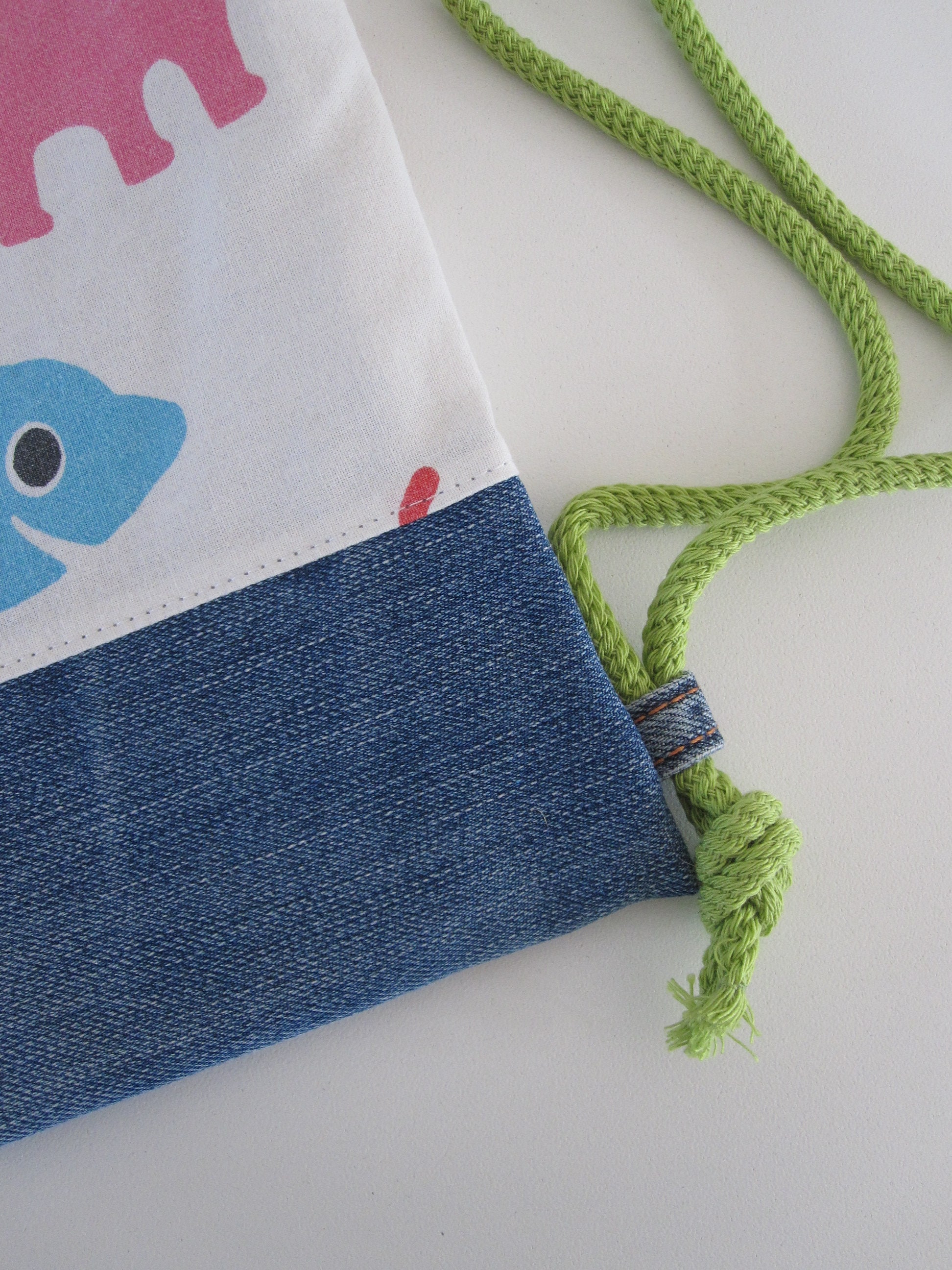 The green cotton cords that match the printed animals run along the two upper edges of the gym bag through two orange drawstrings and along the lower side seams through two loops (the belt loops of the discarded jeans). The length of the cords can be adjusted by knotting the ends below the loops.
