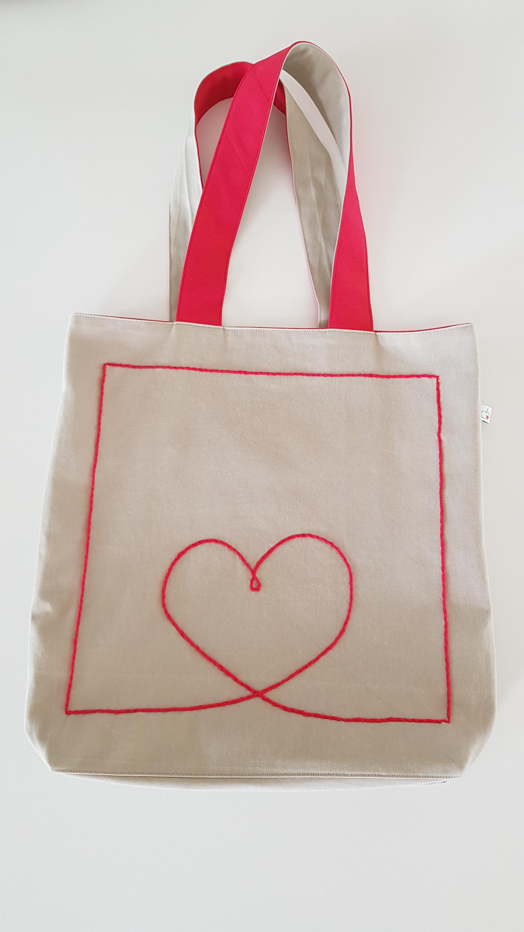 The large heart motif within the frame has been carefully embroidered onto the front of the bag with pink cotton yarn, making it truly special. It is therefore also a wonderful gift for a loved one!