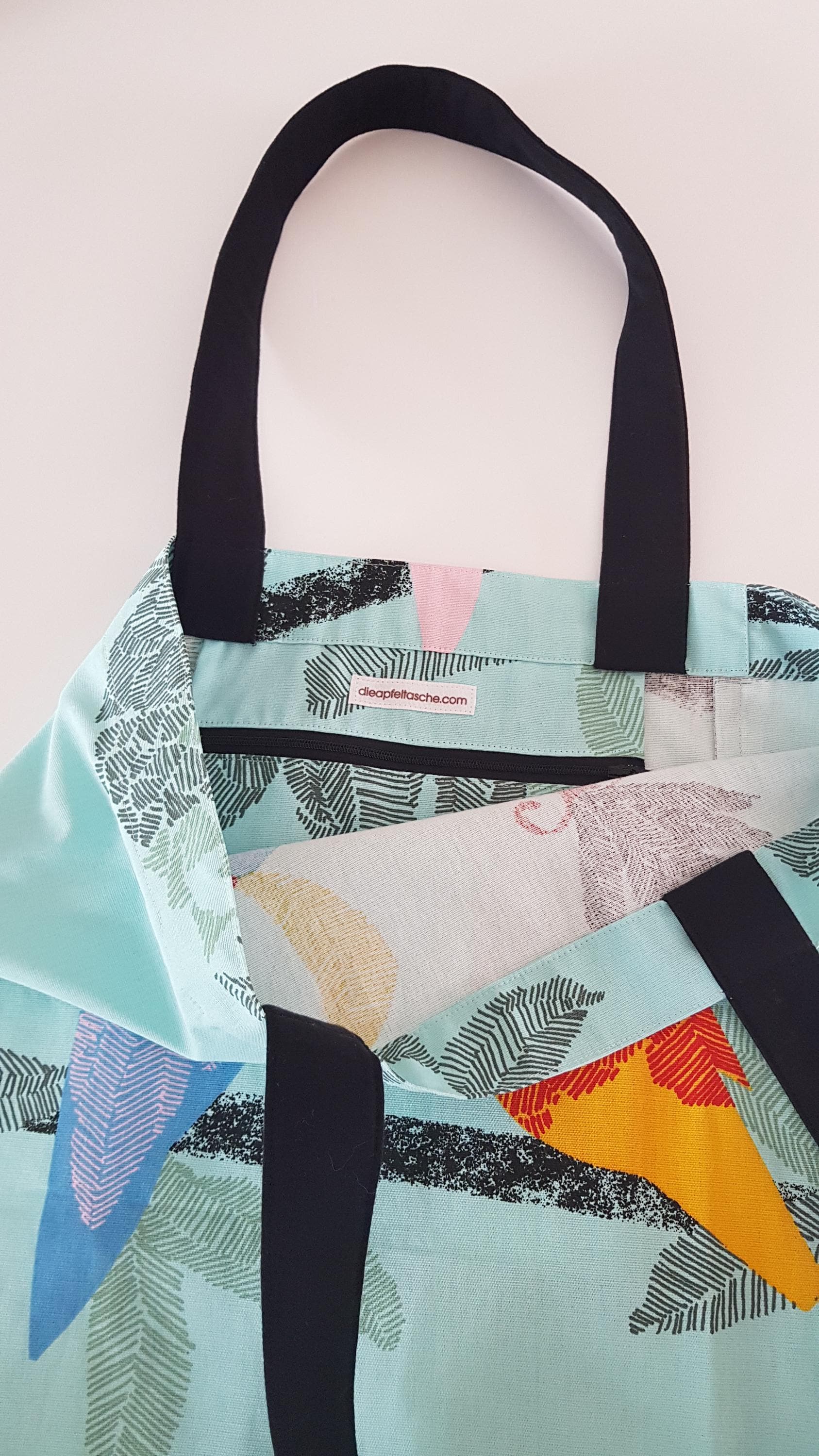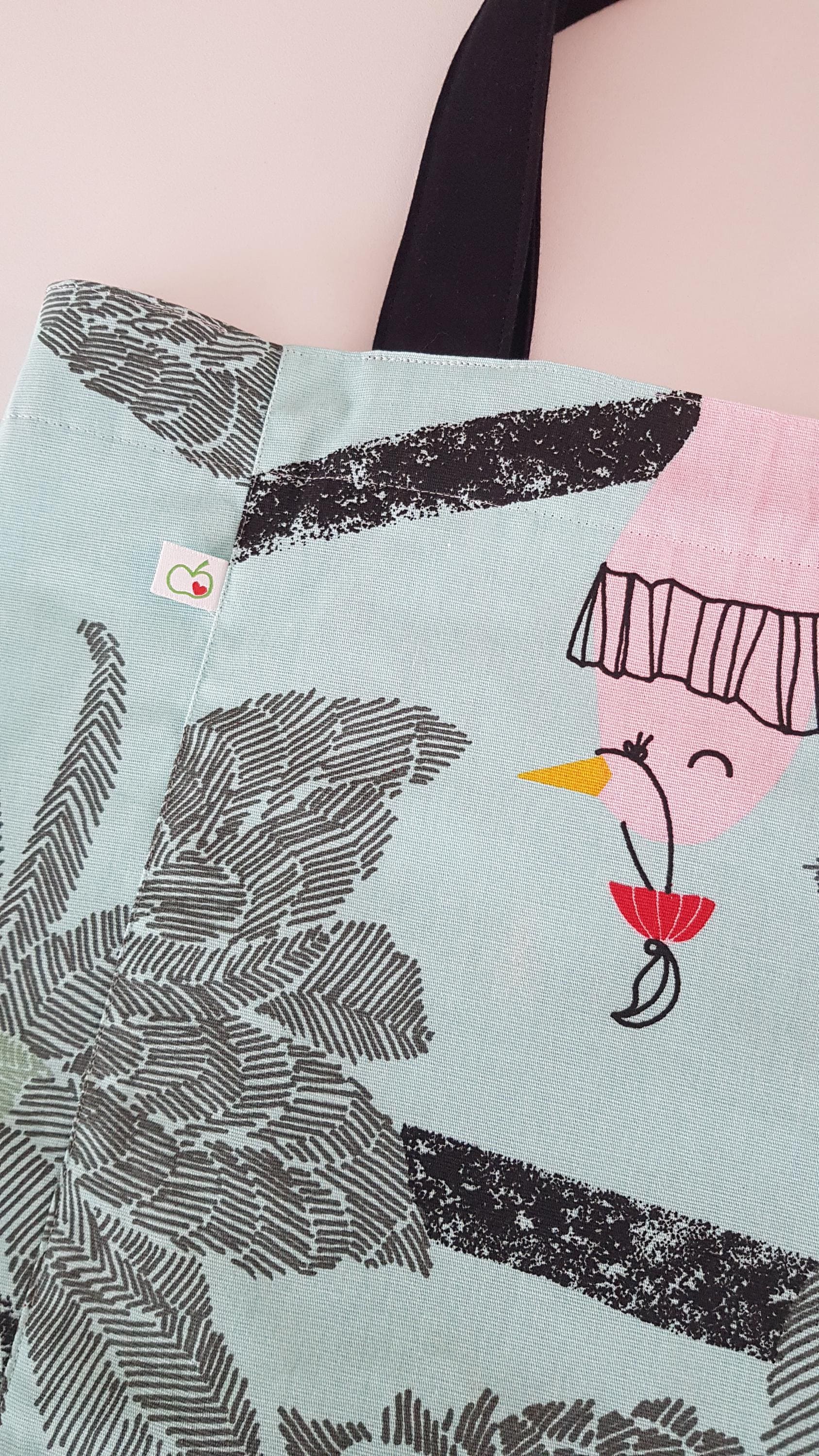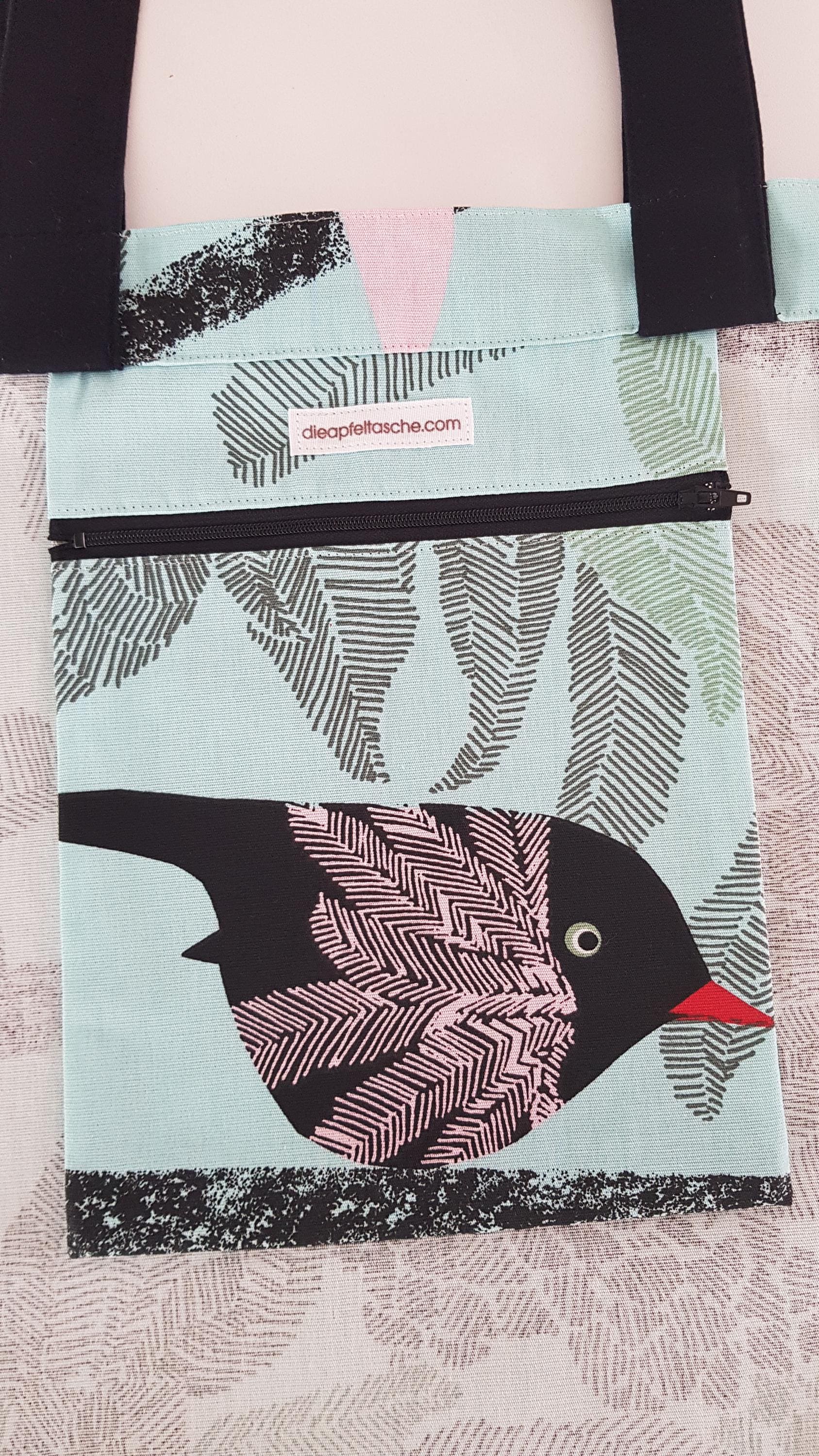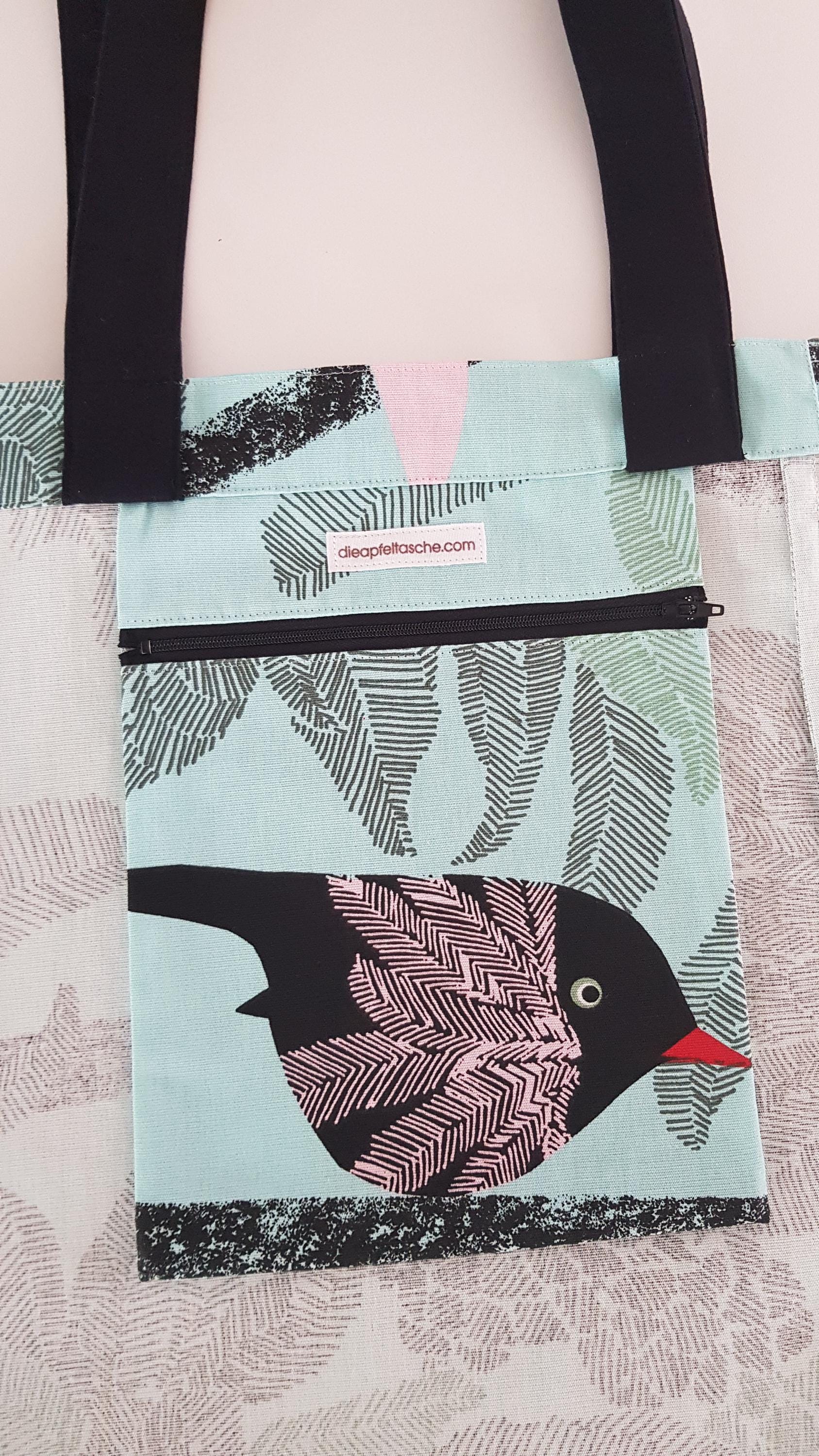 The three feathered friends on the front of this special shopping bag are sure to attract attention. This unique bag is not only an eye-catcher but also an environmentally friendly companion for larger purchases. It is sewn entirely from reused fabric and, at 46 cm wide and 48 cm high, is a comfortable size. It also features an inside pocket with a black zipper for safely storing your wallet and keys. A special touch: a friendly bird also adorns the inside pocket. Matching the colors of the print motif on the sturdy cotton fabric, this practical shopper has black cotton straps, which are additionally reinforced with a webbing loop.