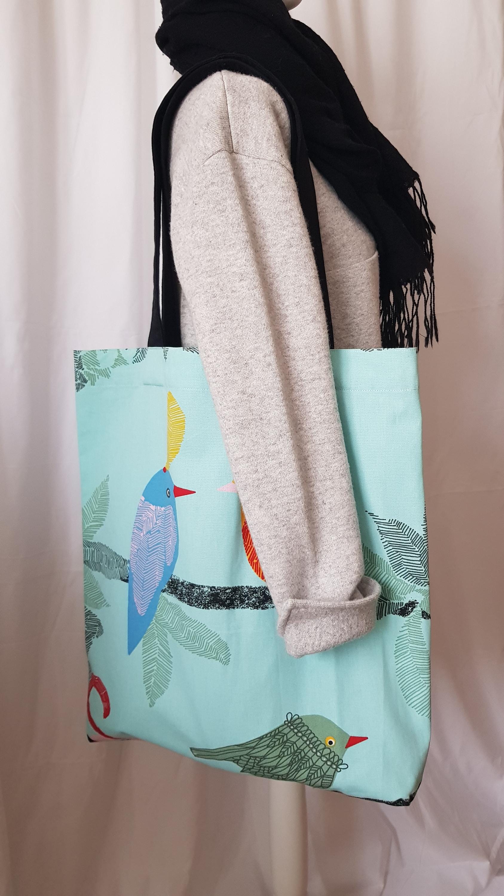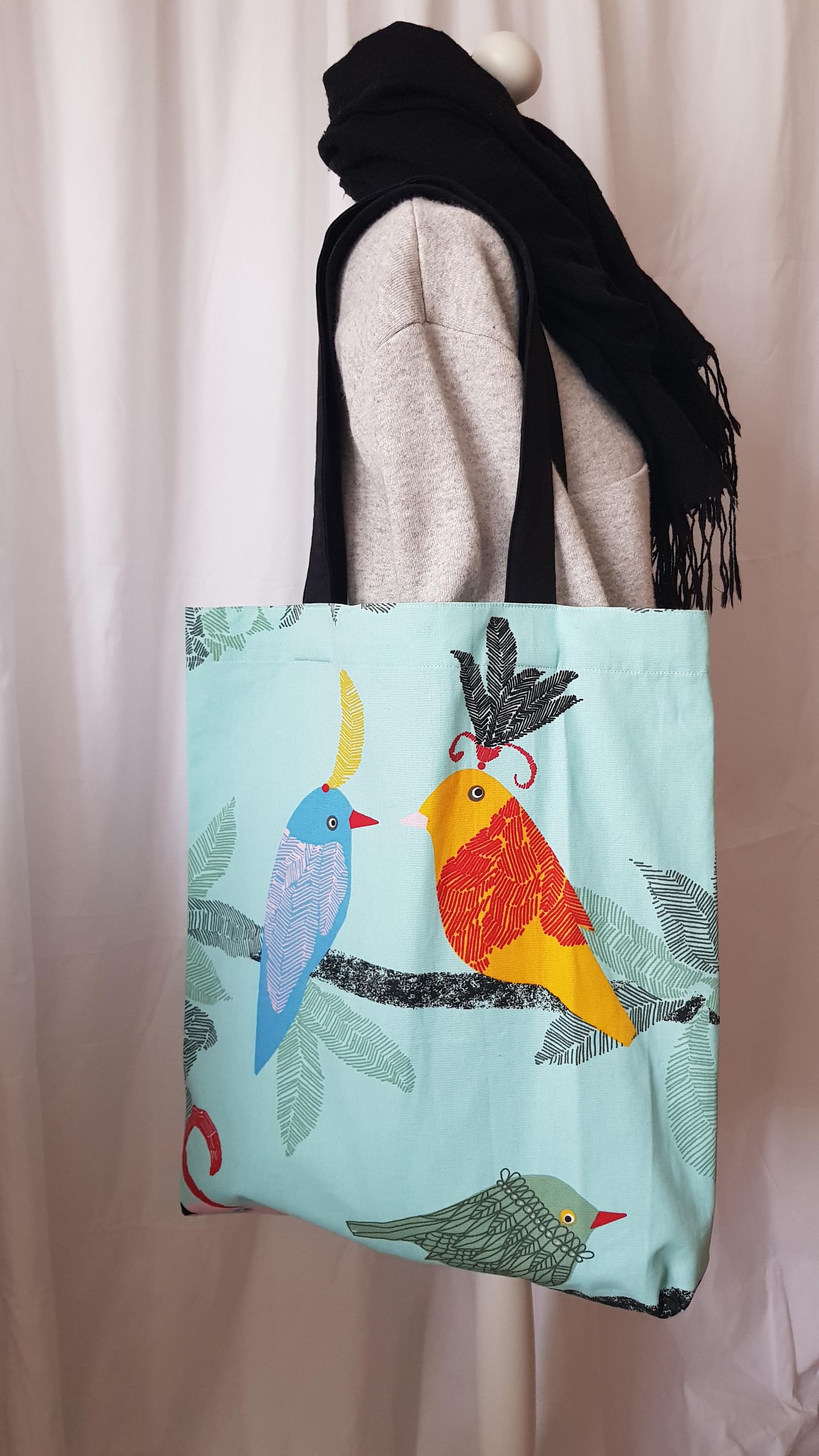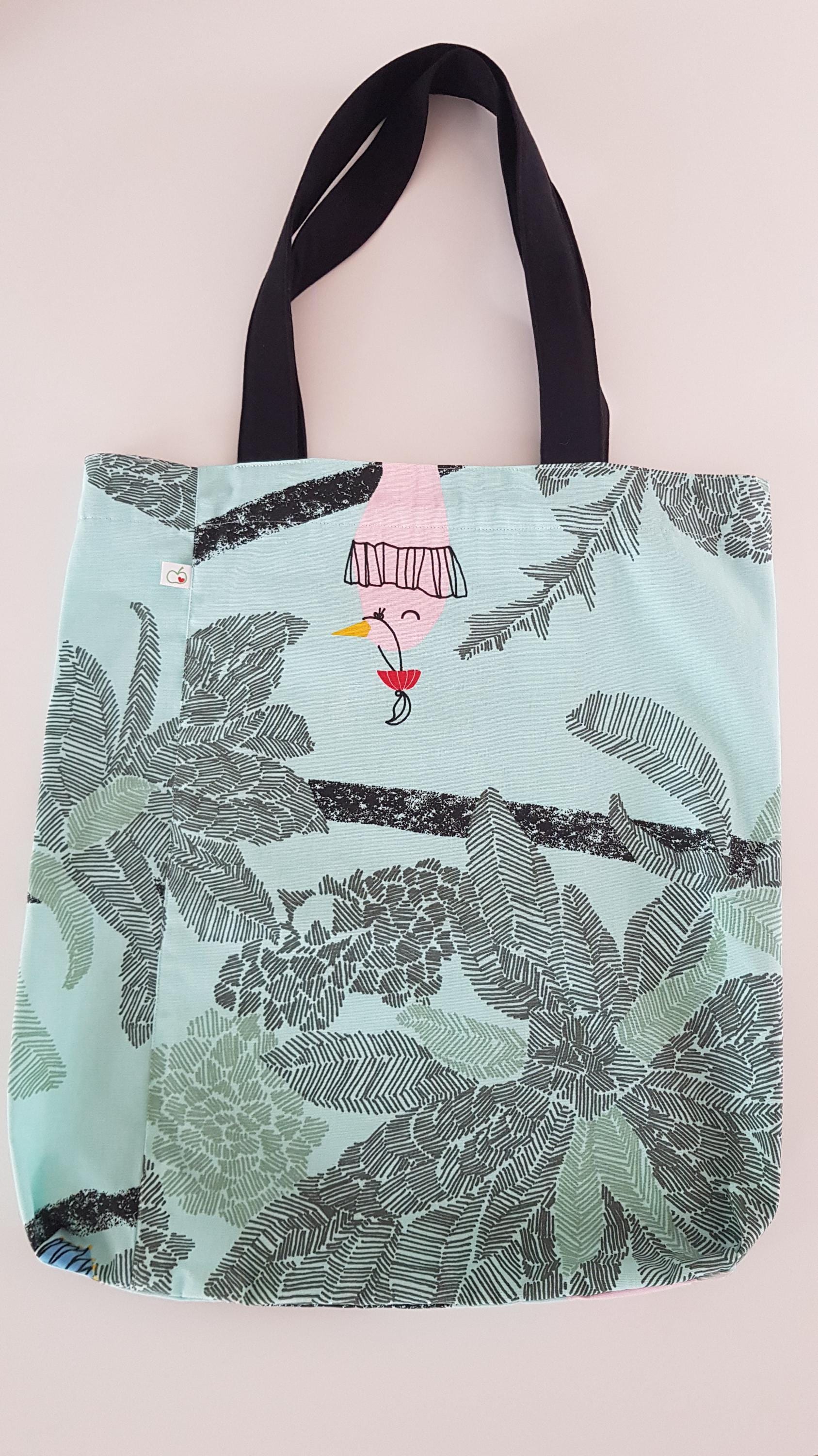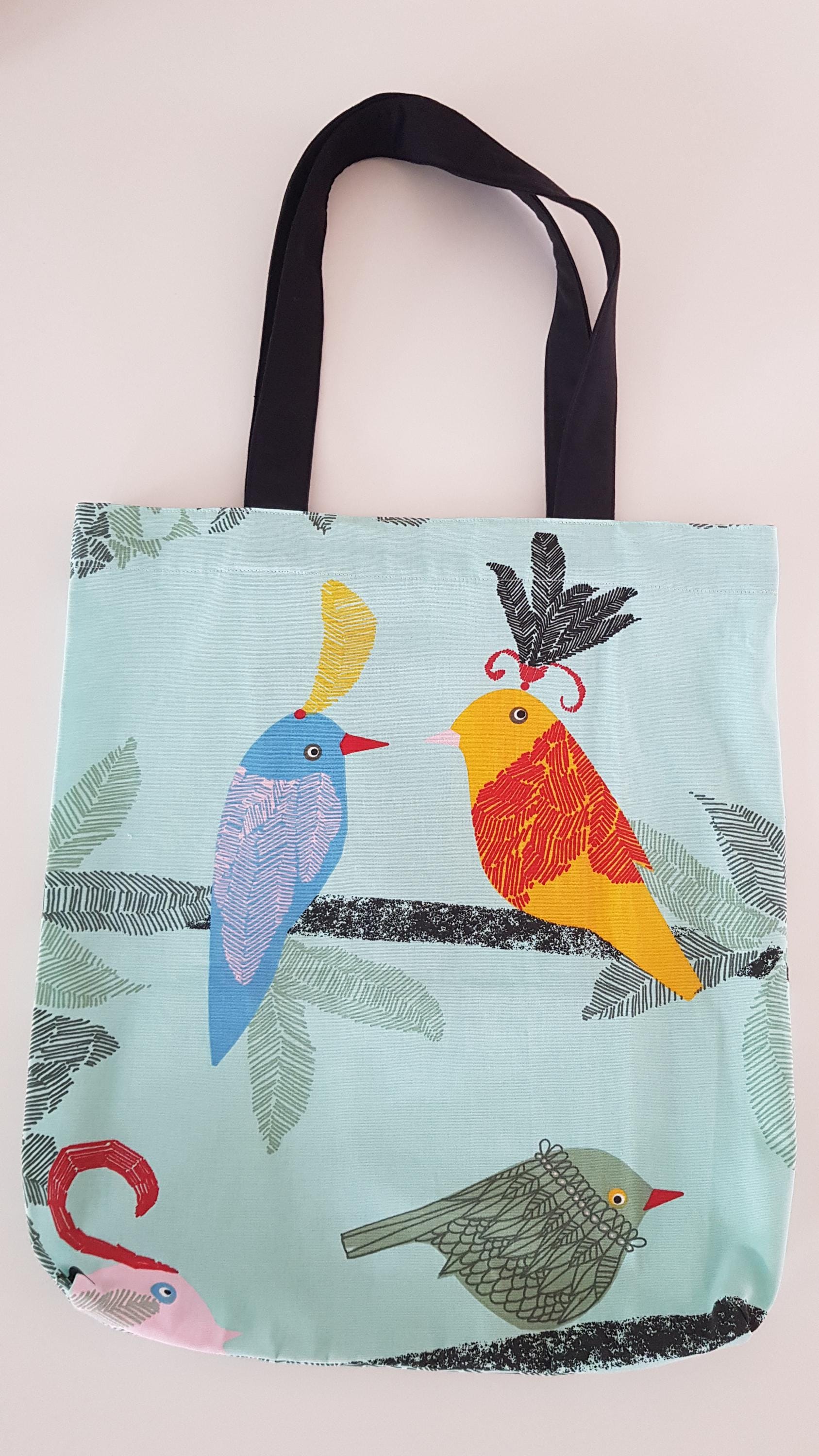 The three feathered friends on the front of this special shopping bag are sure to attract attention. This unique bag is not only an eye-catcher but also an environmentally friendly companion for larger purchases. It is sewn entirely from reused fabric and, at 46 cm wide and 48 cm high, is a comfortable size. It also features an inside pocket with a black zipper for safely storing your wallet and keys. A special touch: a friendly bird also adorns the inside pocket. Matching the colors of the print motif on the sturdy cotton fabric, this practical shopper has black cotton straps, which are additionally reinforced with a webbing loop.