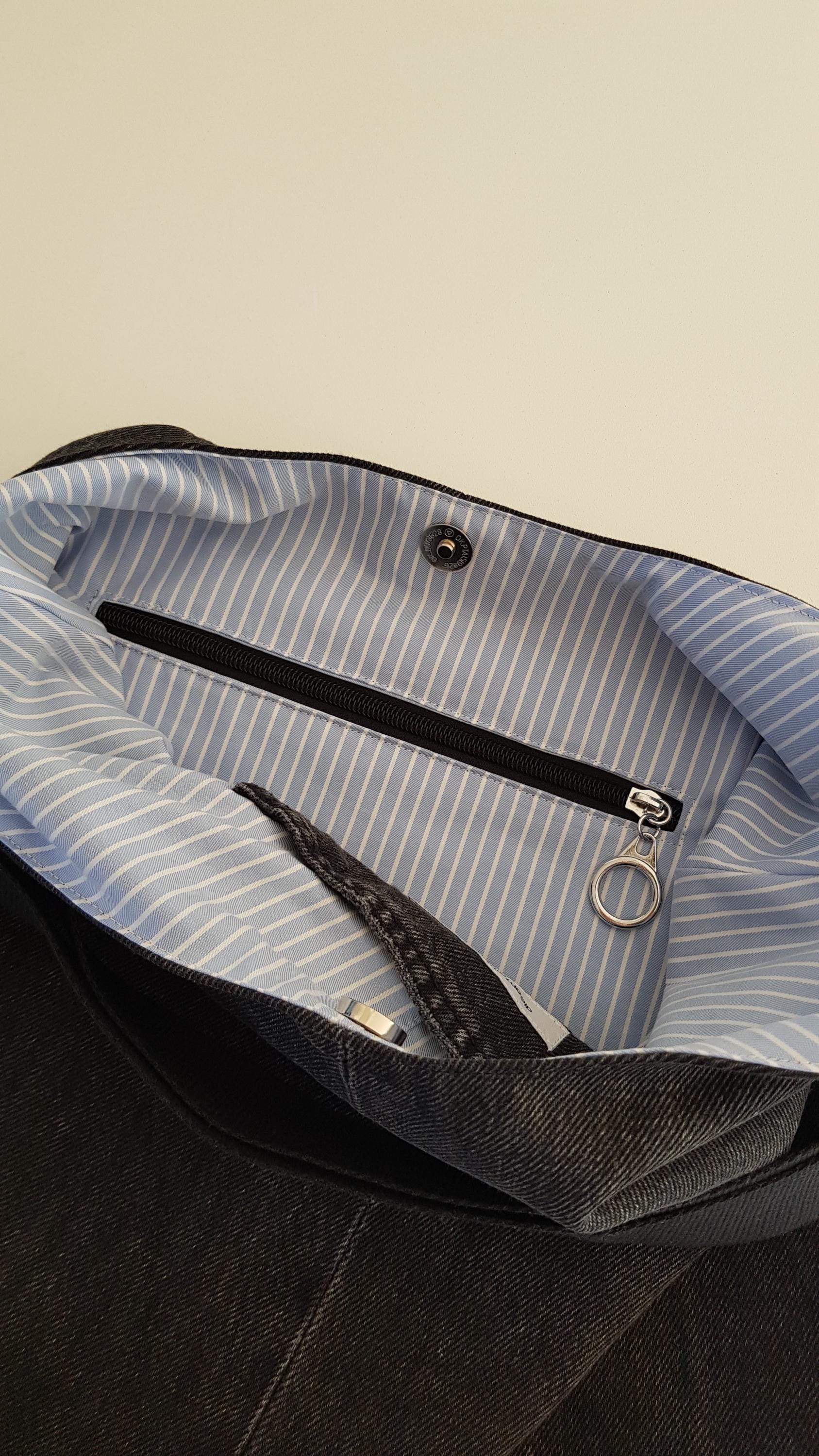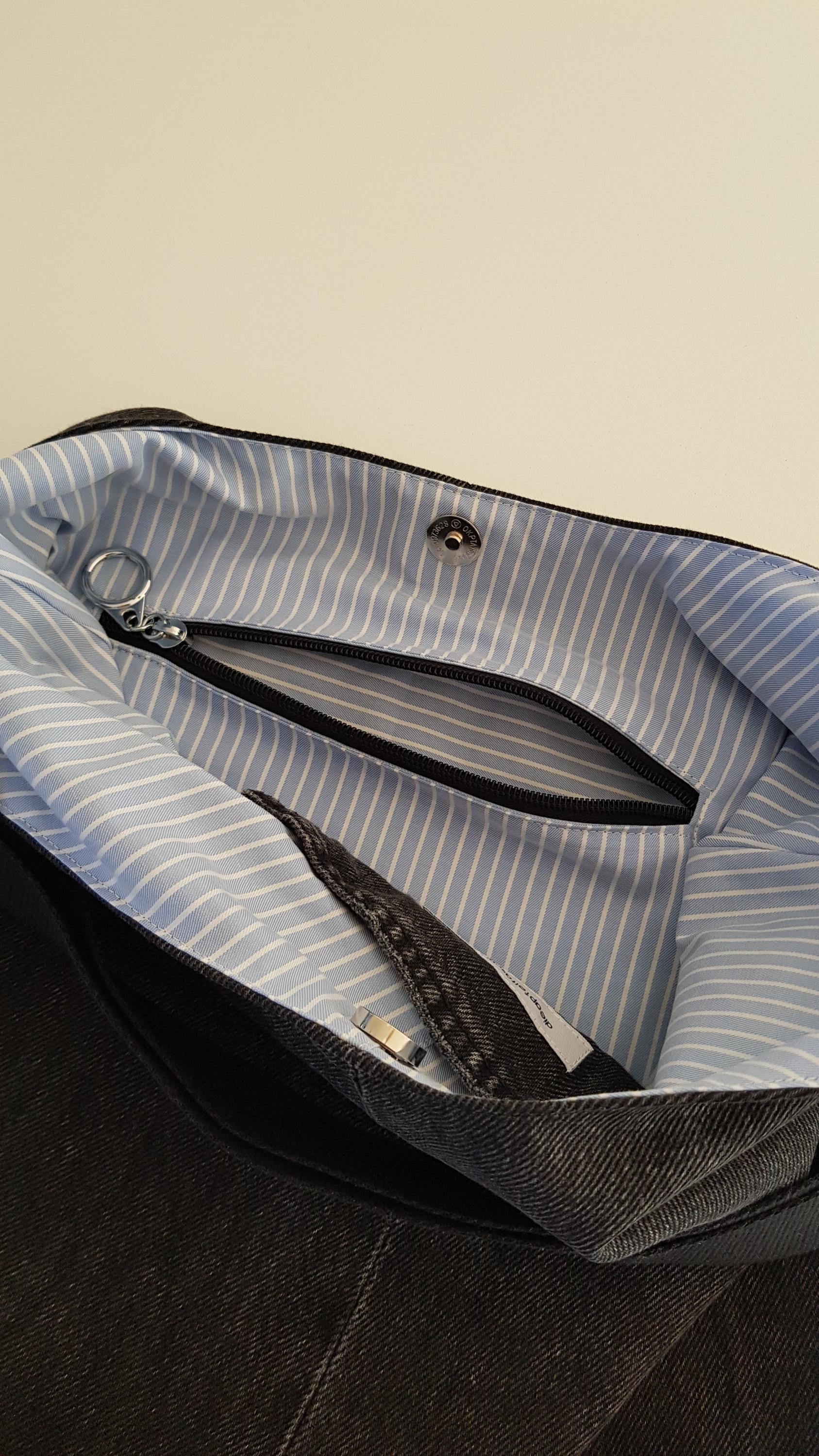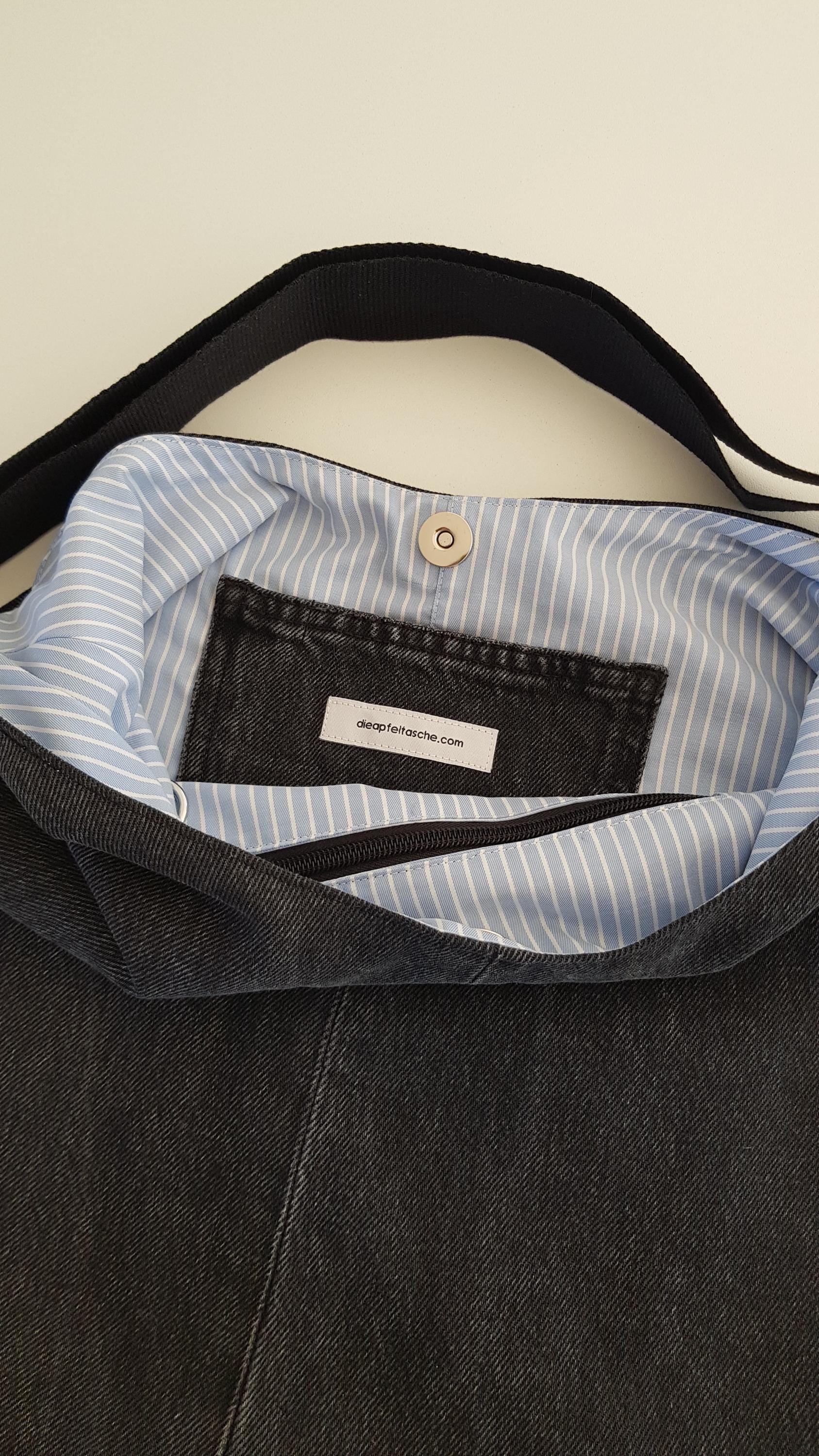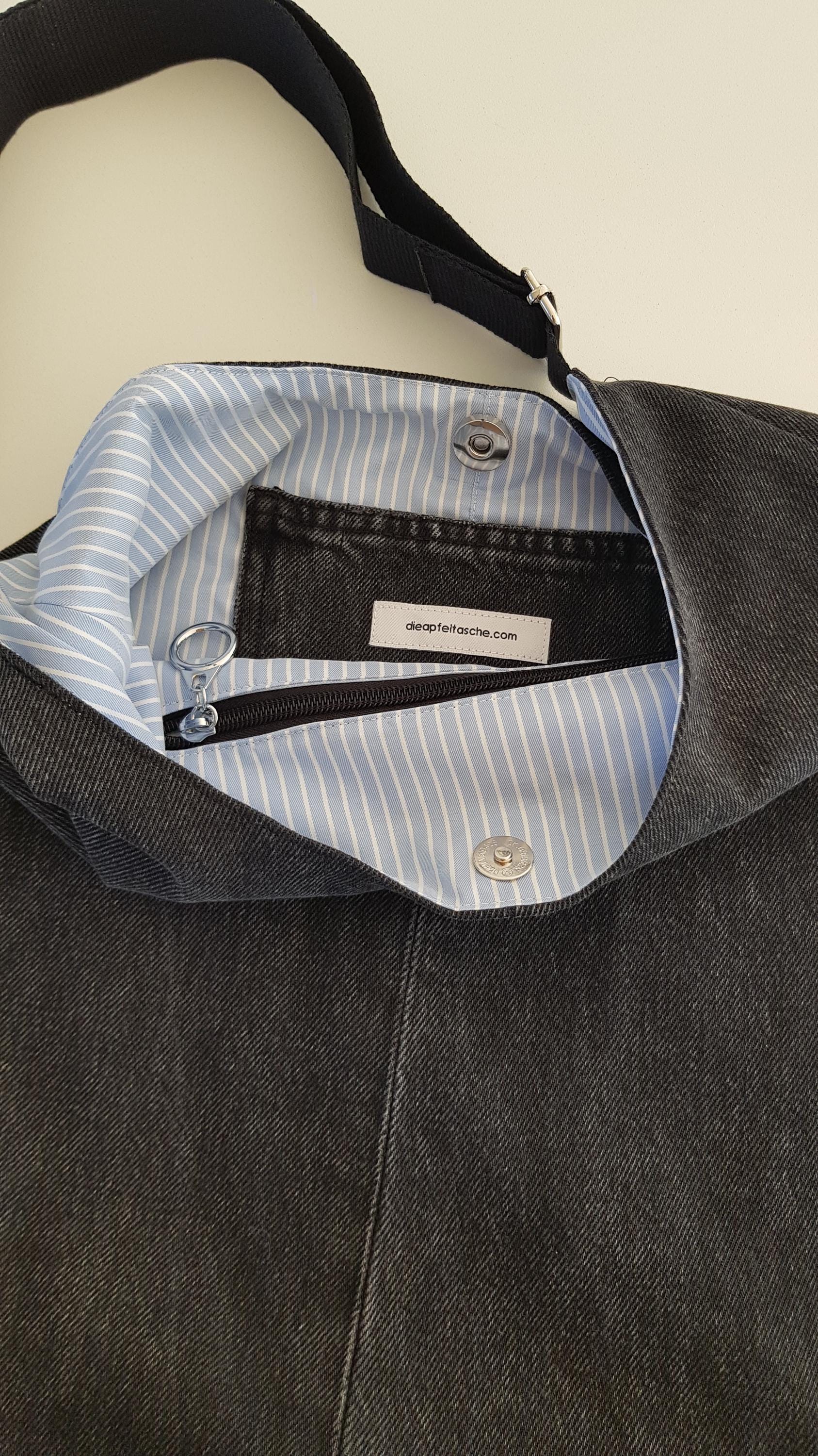 The sustainable and vegan shoulder bag is sewn from a discarded pair of black jeans with small grey speckles and a worn-out men's shirt with a classic striped pattern in light blue and white.