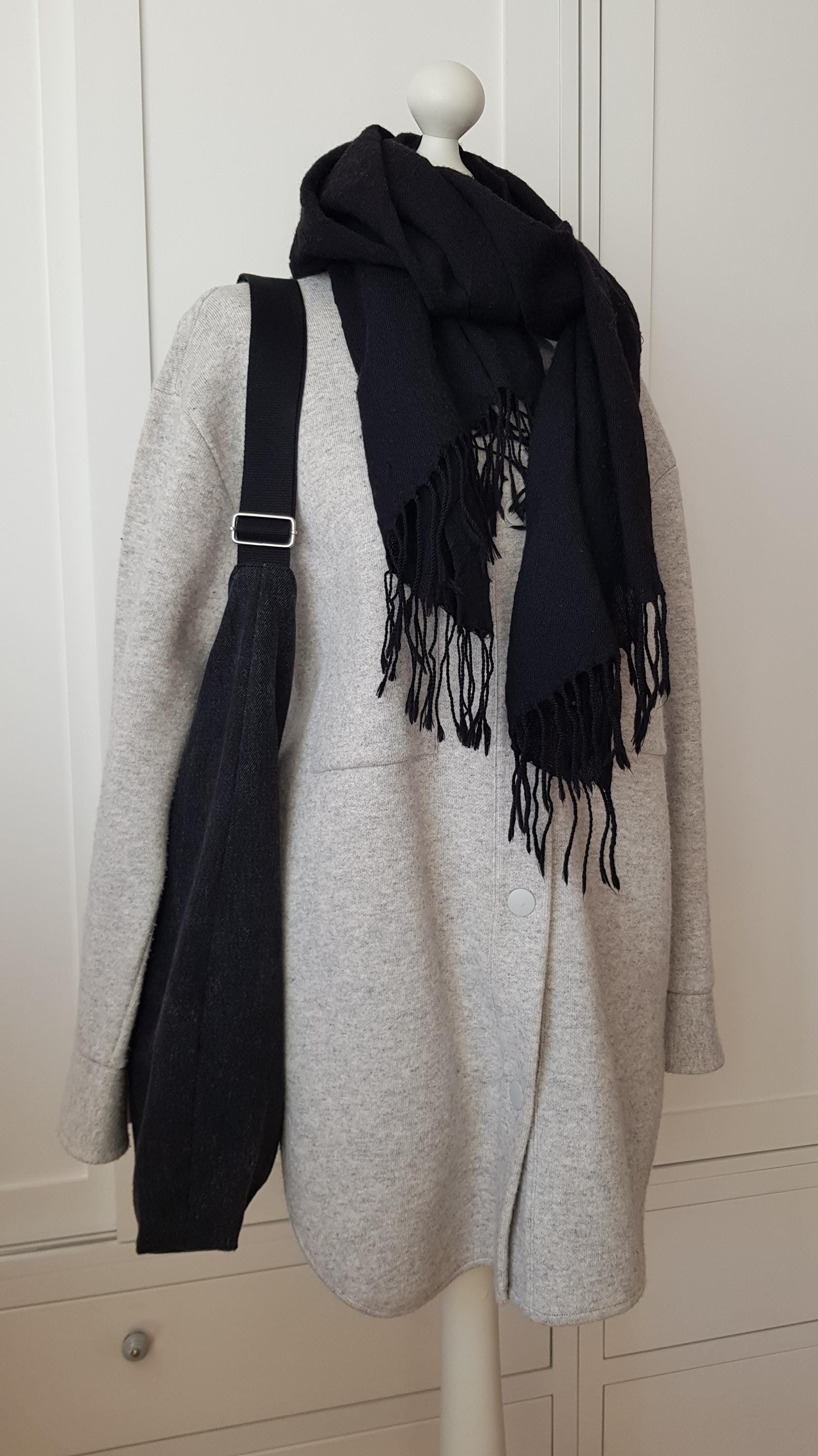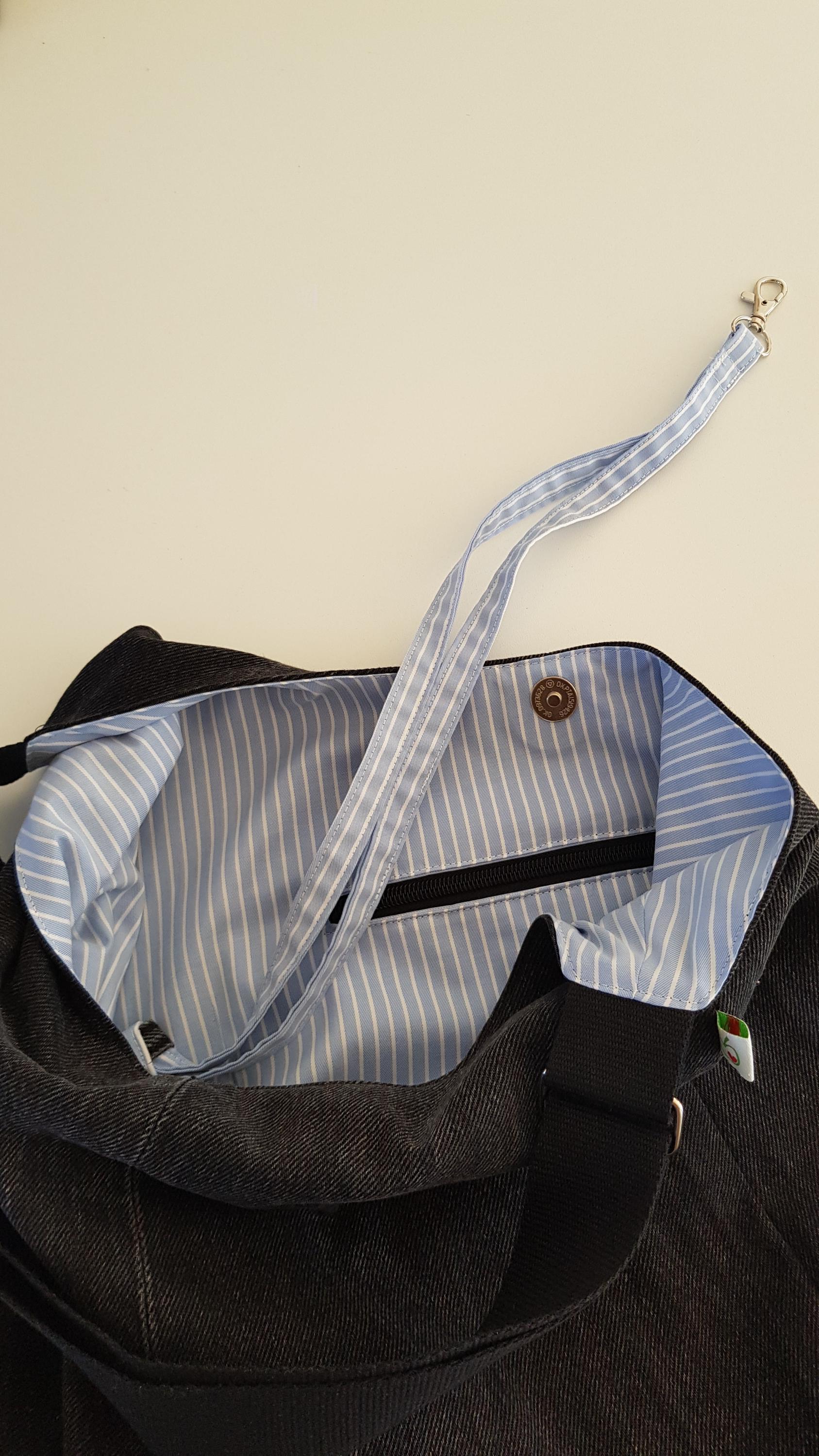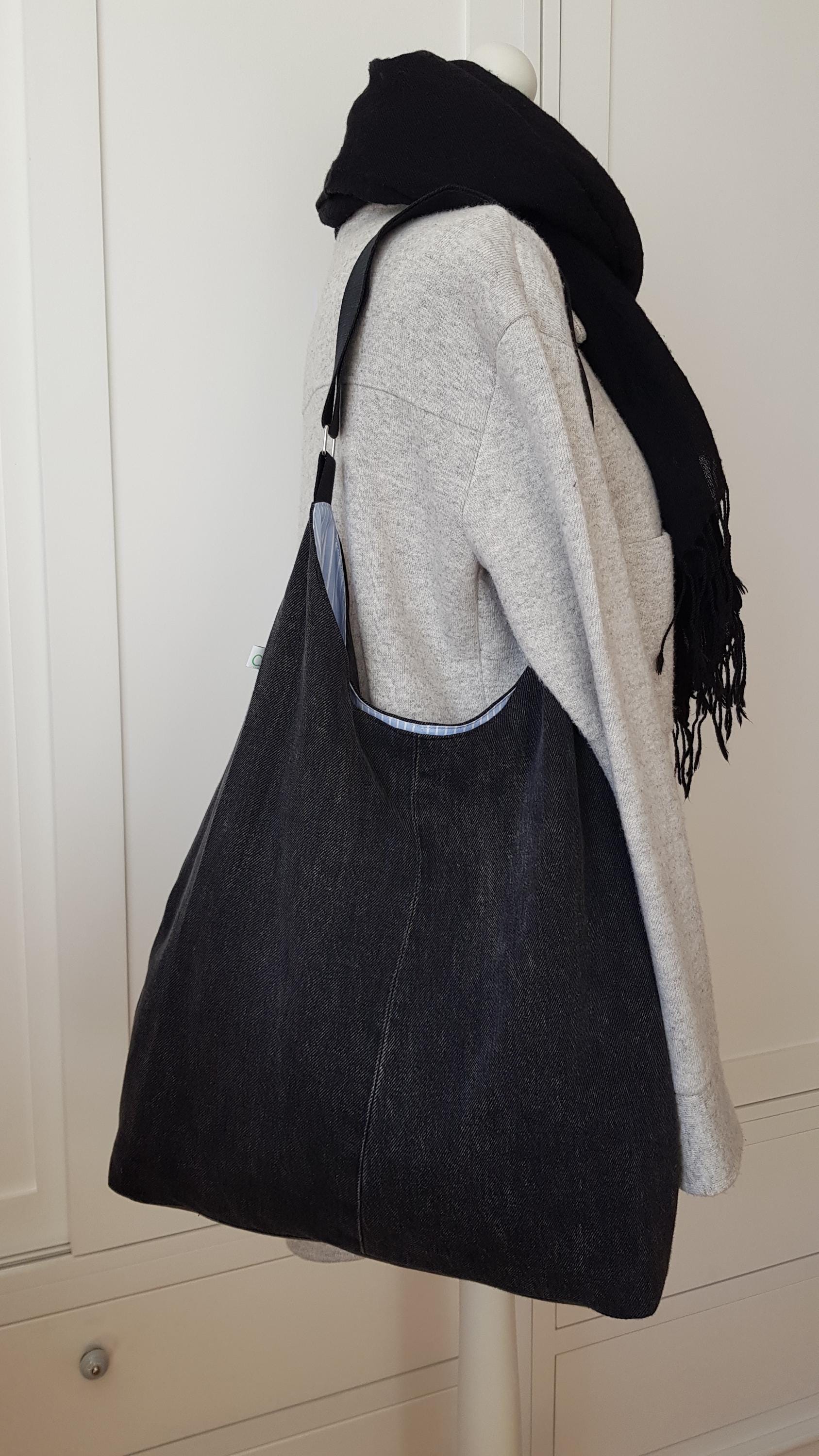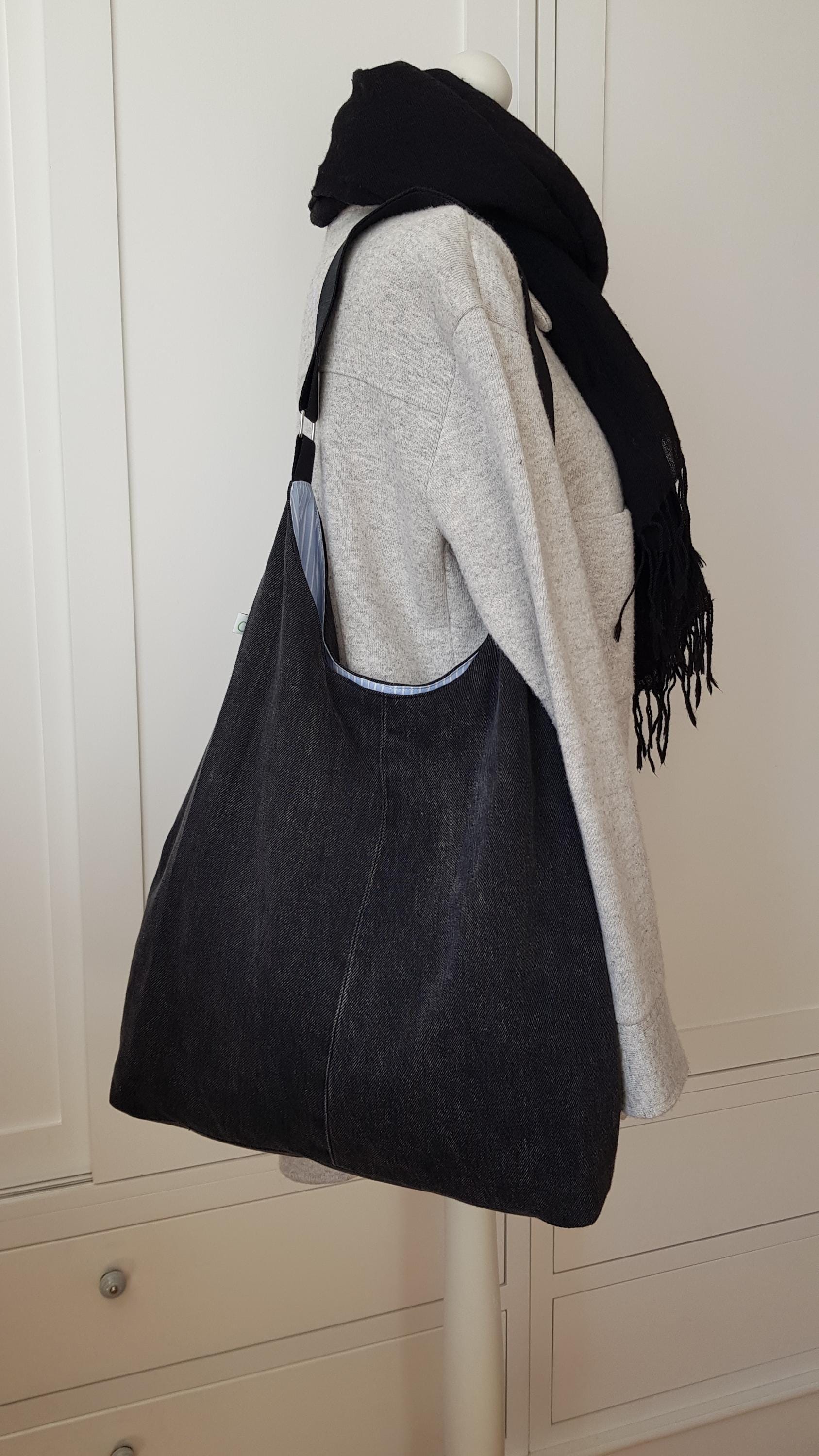 The sustainable and vegan shoulder bag is sewn from a discarded pair of black jeans with small grey speckles and a worn-out men's shirt with a classic striped pattern in light blue and white.