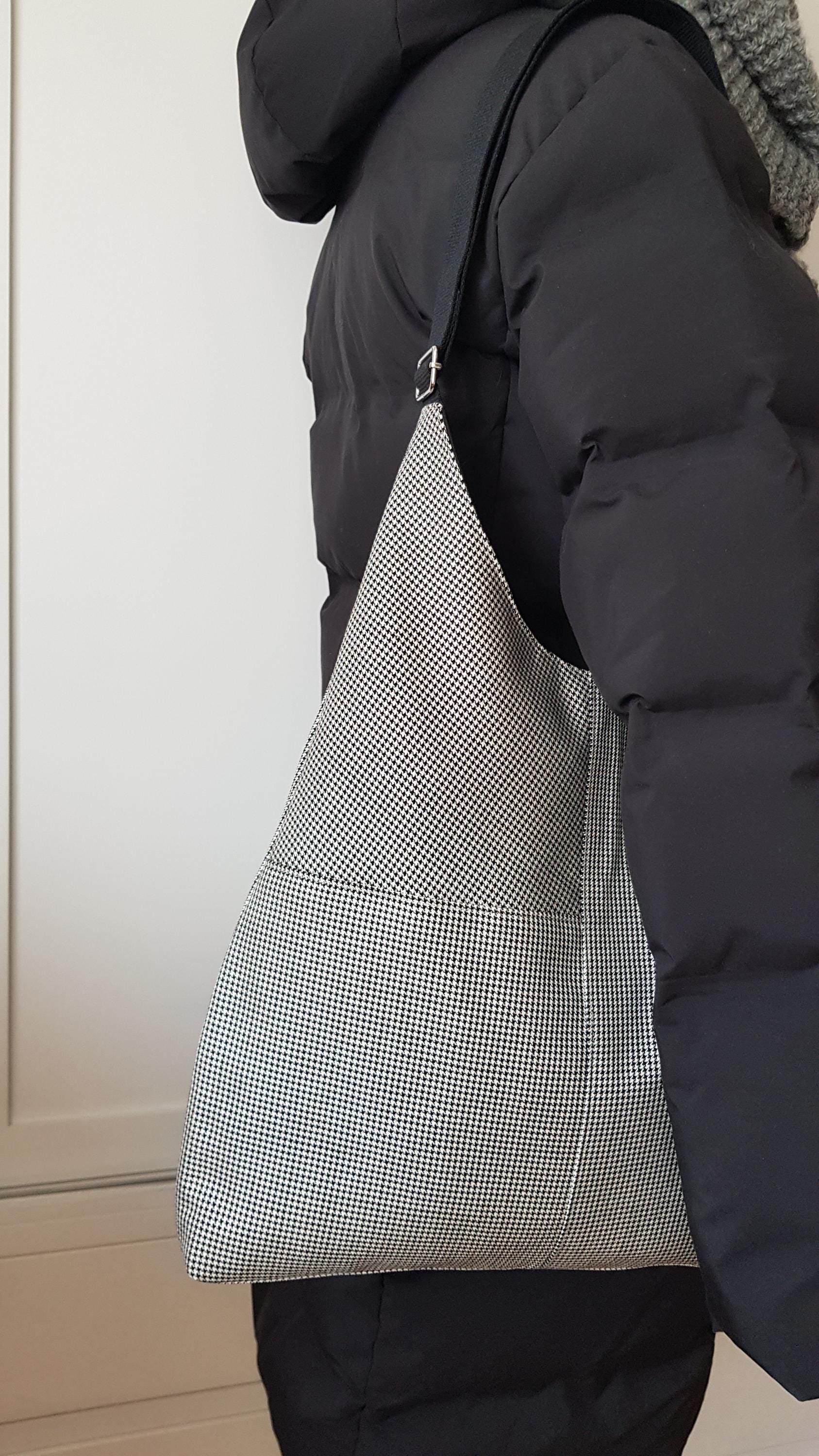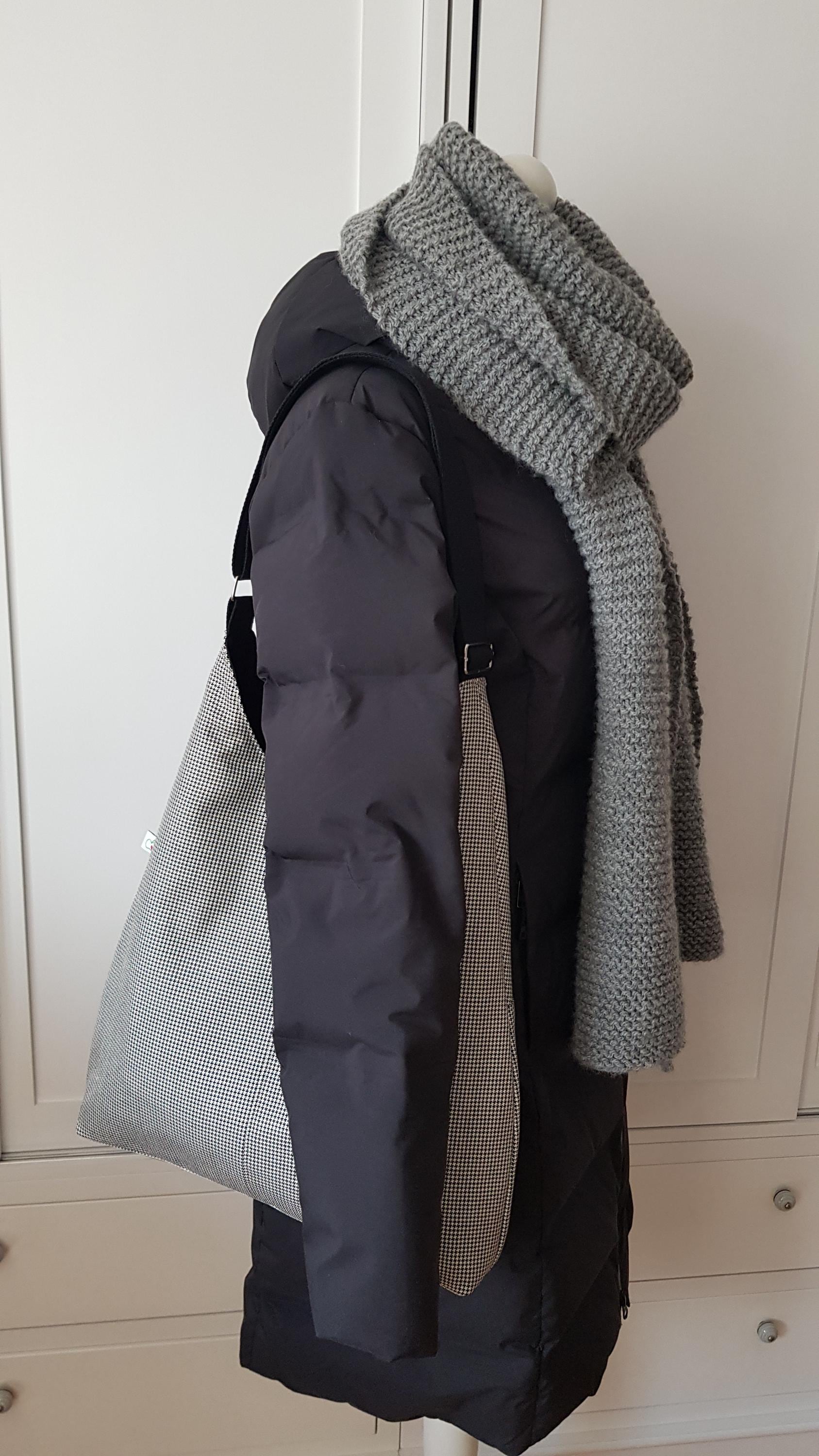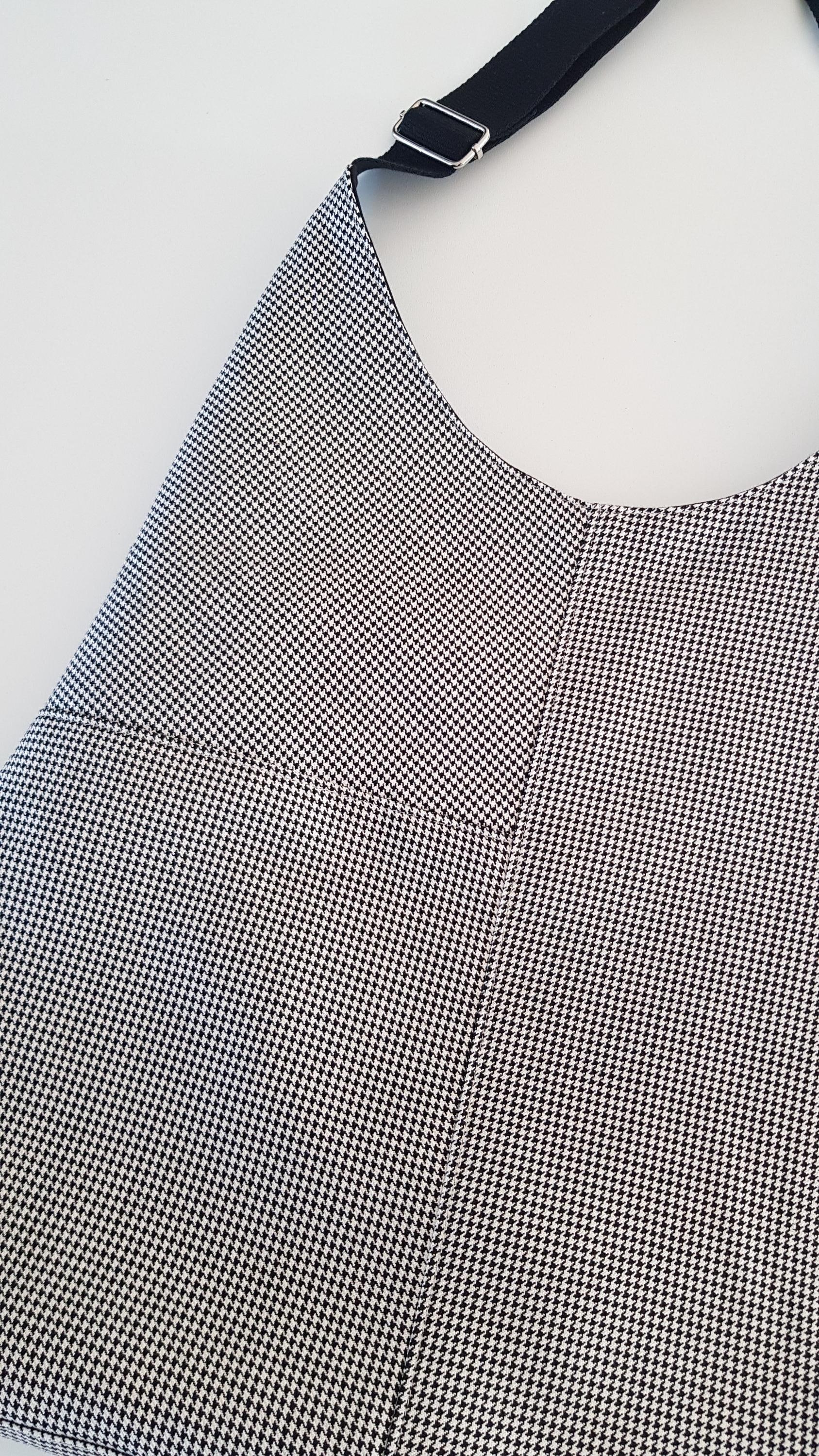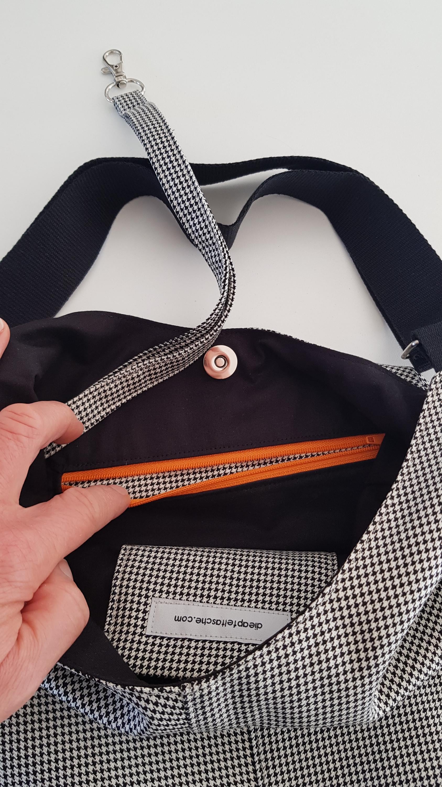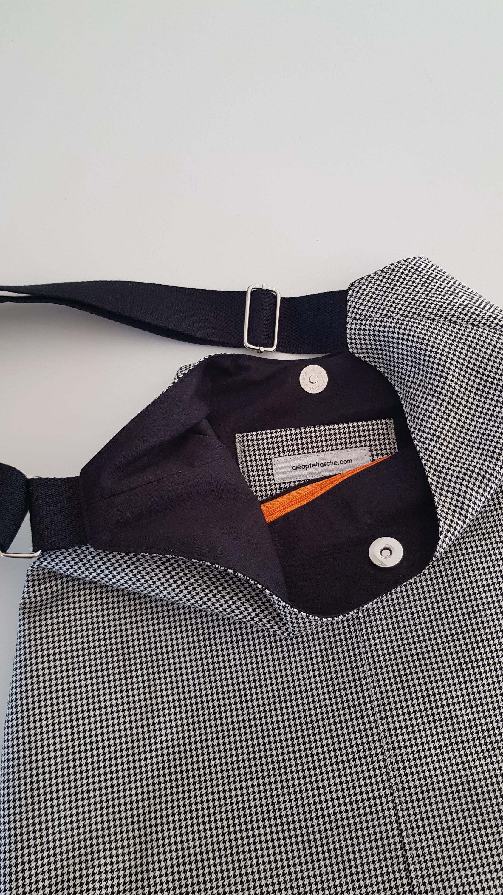 Are you looking for an elegant new bag that not only looks great but also scores points for sustainability? Then this unique shoulder bag made of high-quality wool fabric might be just right for you. The special feature: it's sewn from a discarded men's jacket with a classic houndstooth pattern and has two different sides. For the outer sides of the bag, the wool fabric was cut into rectangles of varying sizes and then assembled into a graphic pattern. The houndstooth pattern also meets at different angles, giving this feminine bag an extraordinary touch.