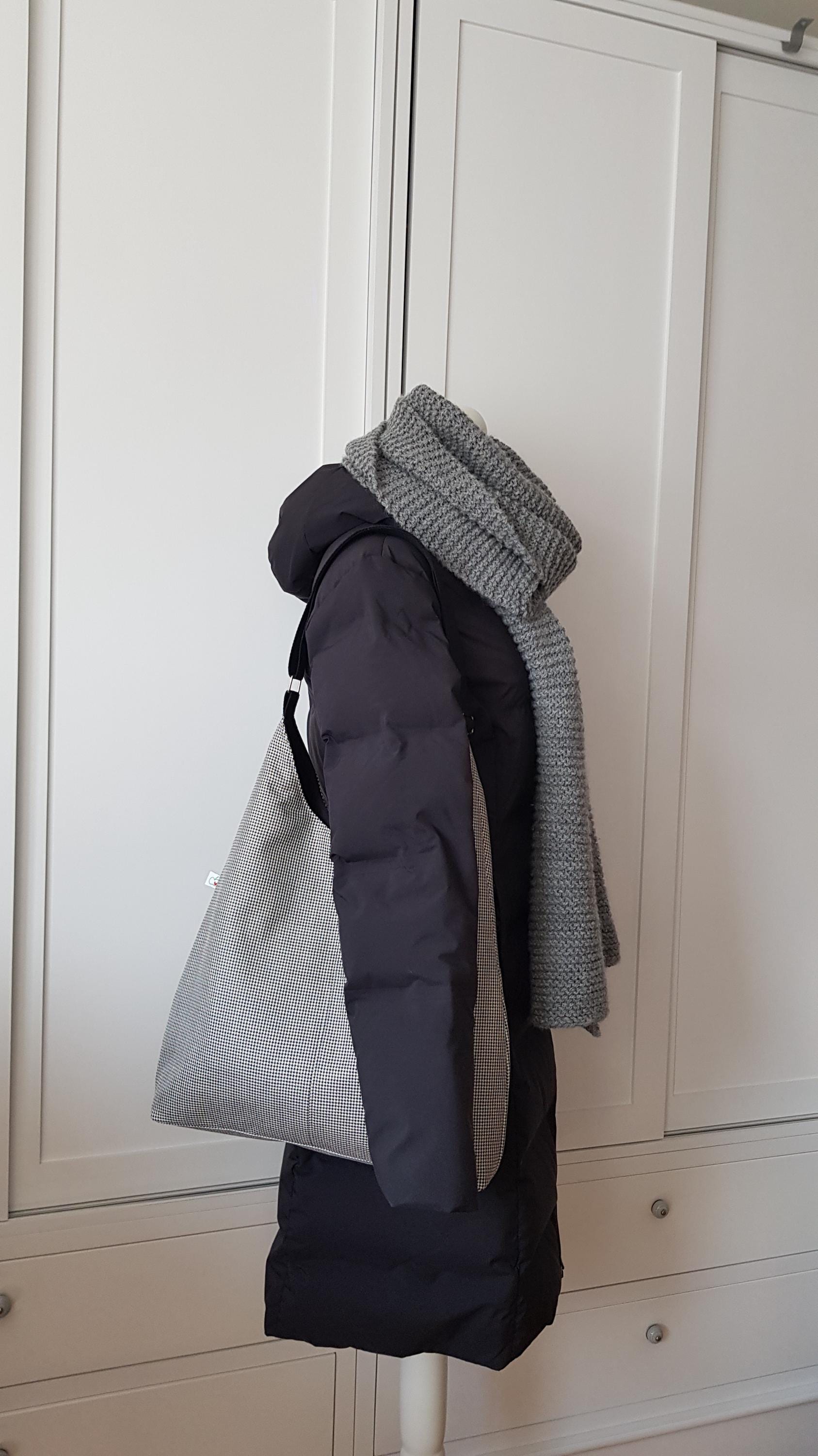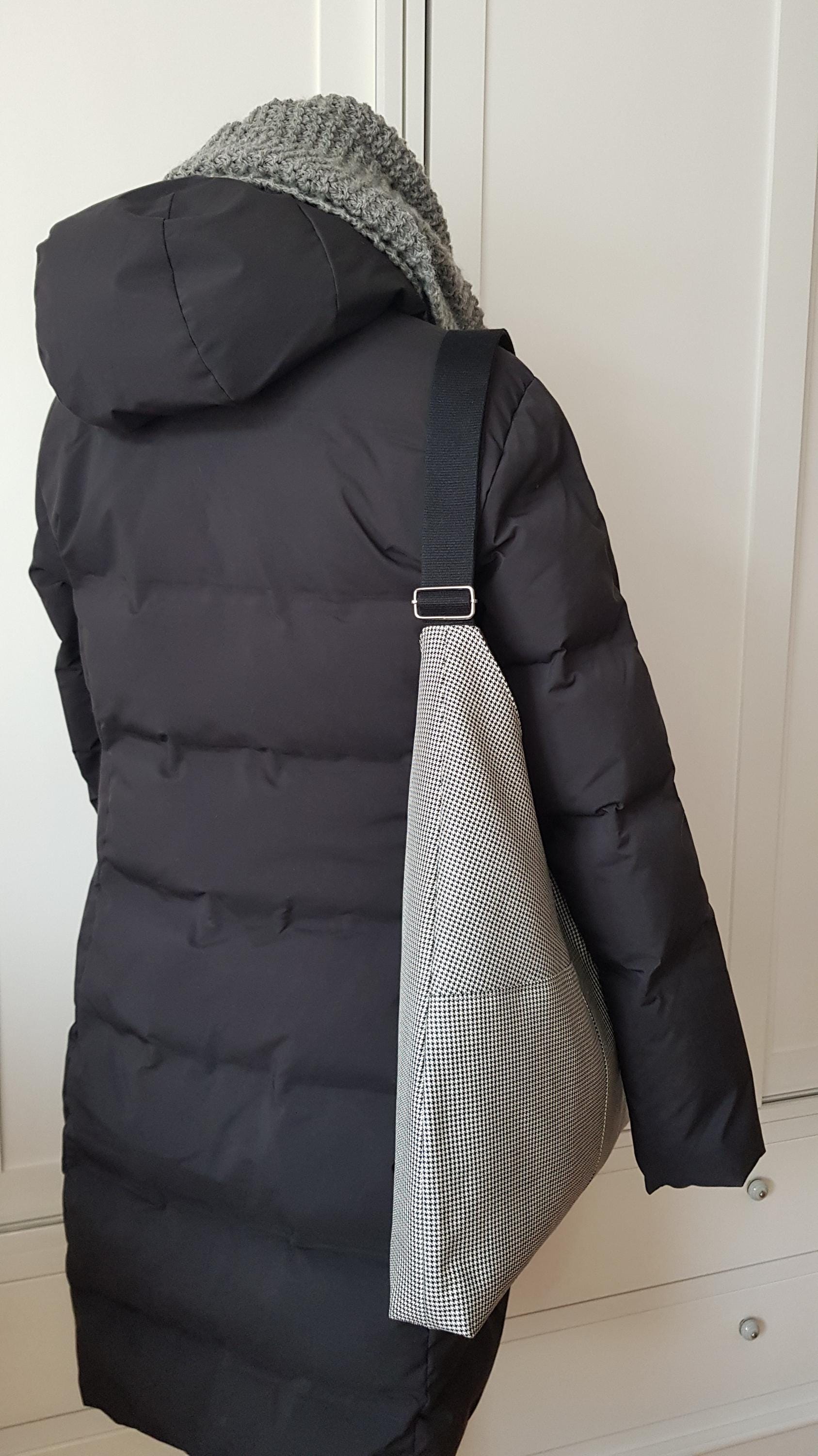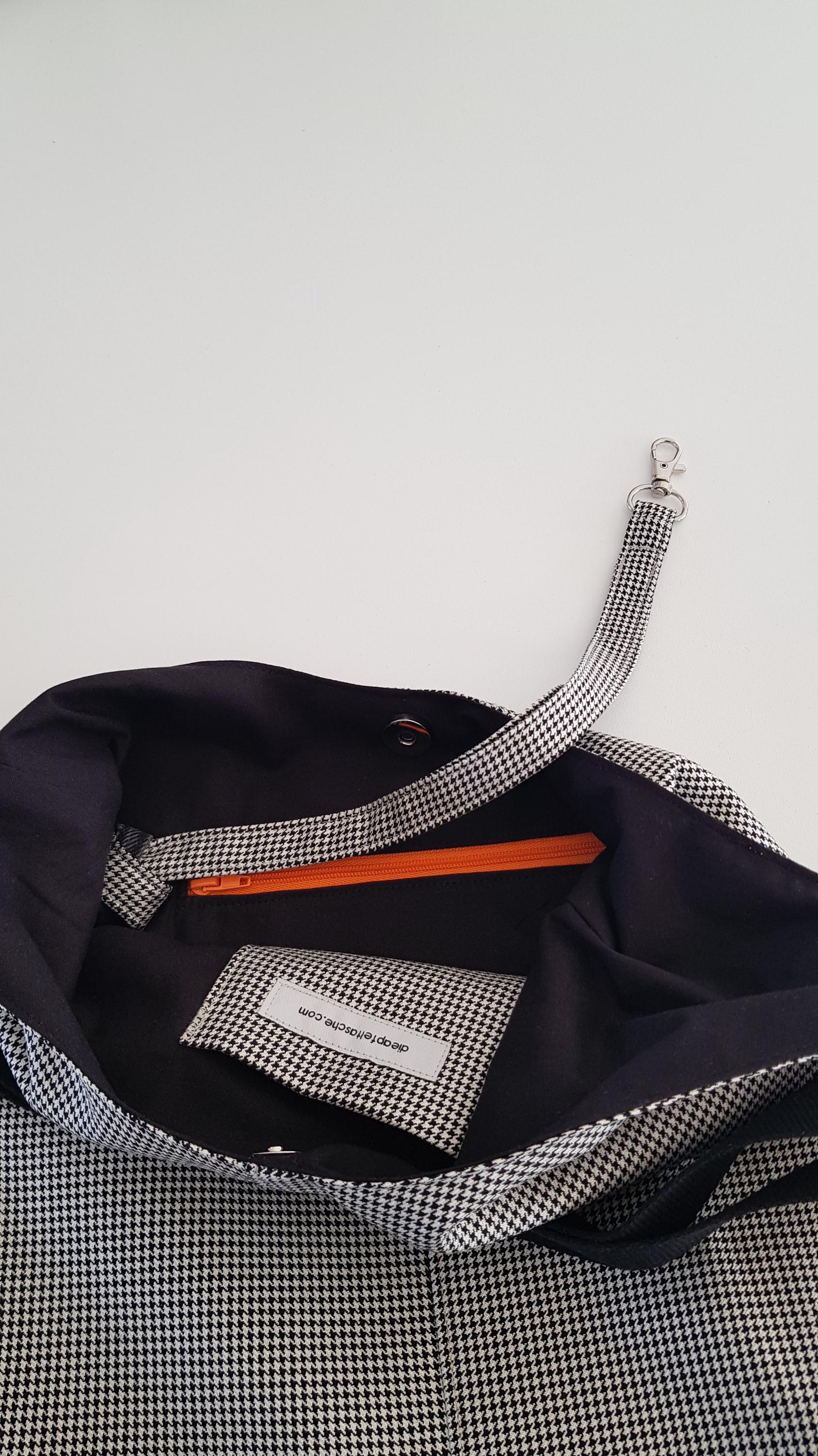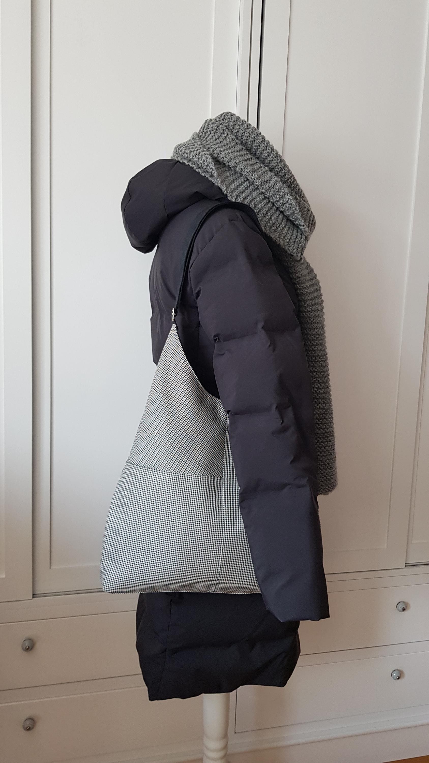 Are you looking for an elegant new bag that not only looks great but also scores points for sustainability? Then this unique shoulder bag made of high-quality wool fabric might be just right for you. The special feature: it's sewn from a discarded men's jacket with a classic houndstooth pattern and has two different sides. For the outer sides of the bag, the wool fabric was cut into rectangles of varying sizes and then assembled into a graphic pattern. The houndstooth pattern also meets at different angles, giving this feminine bag an extraordinary touch.