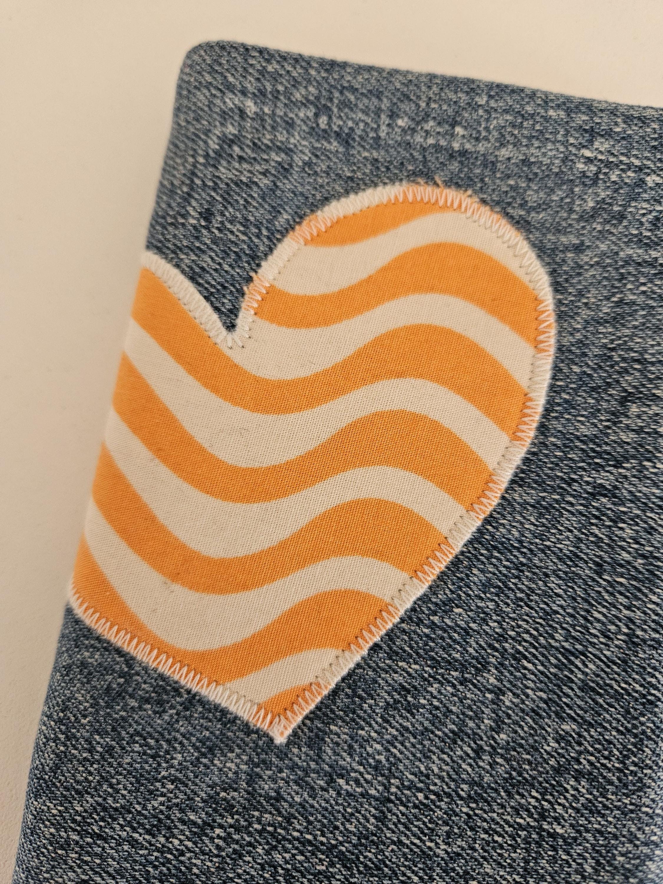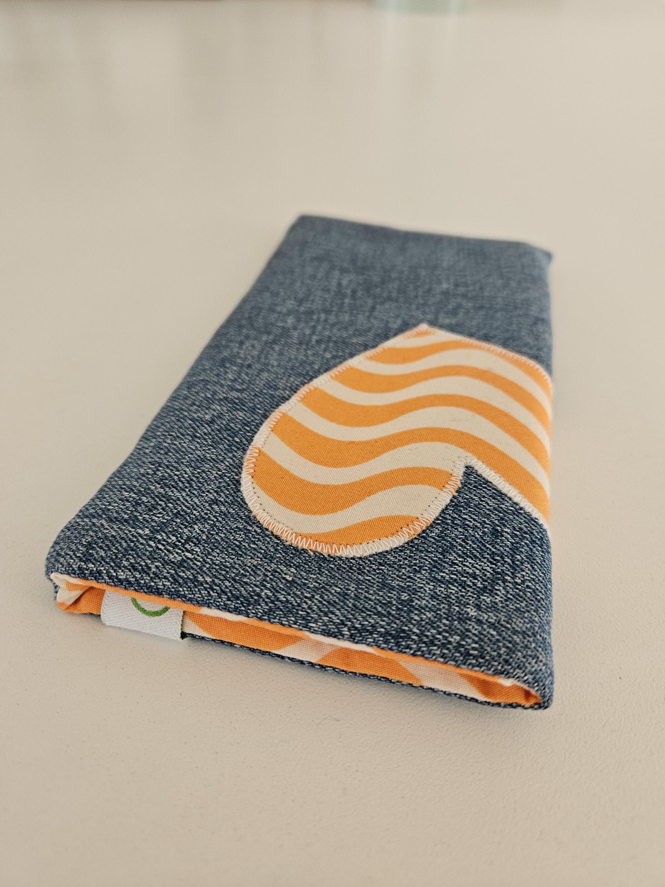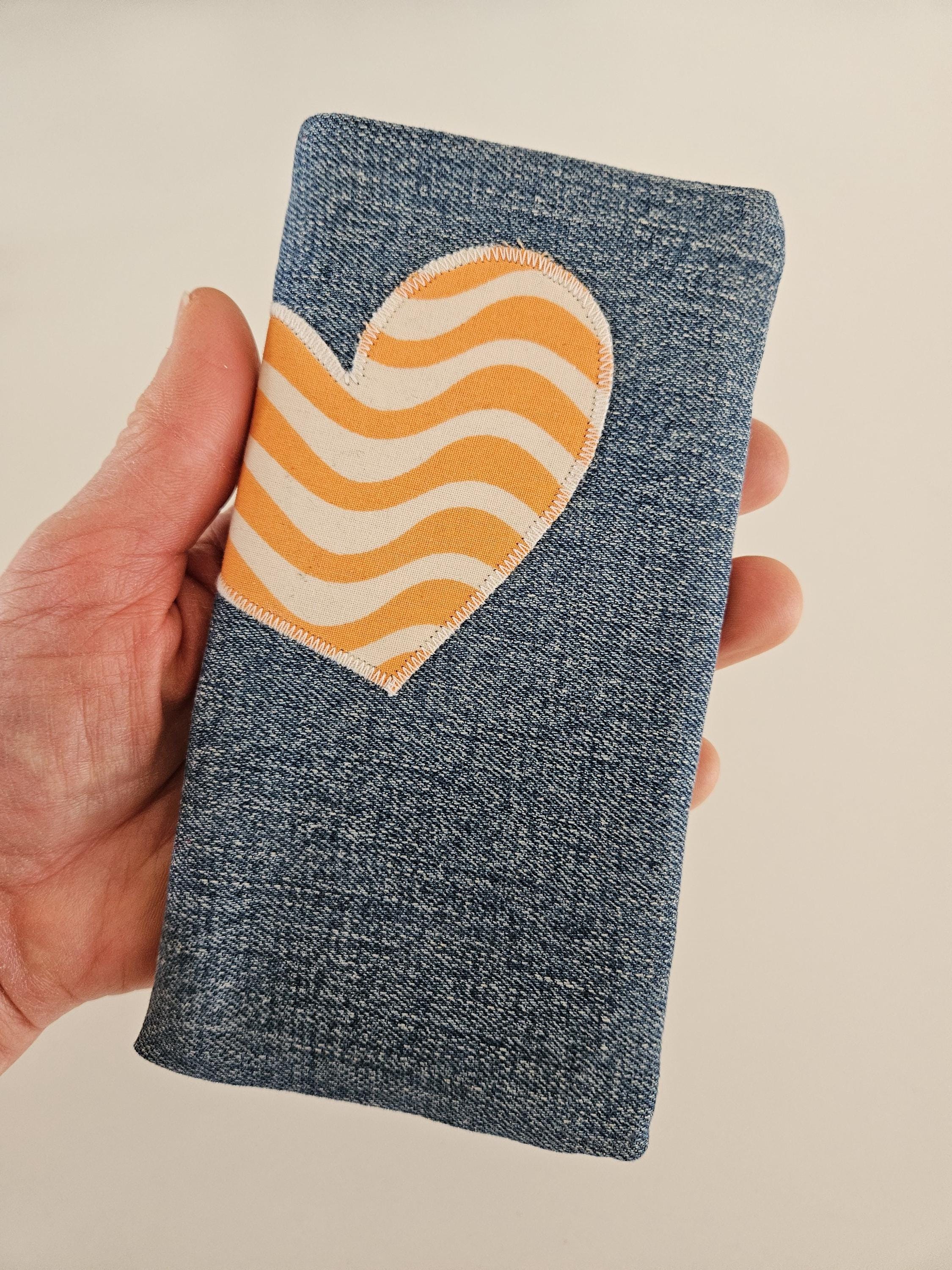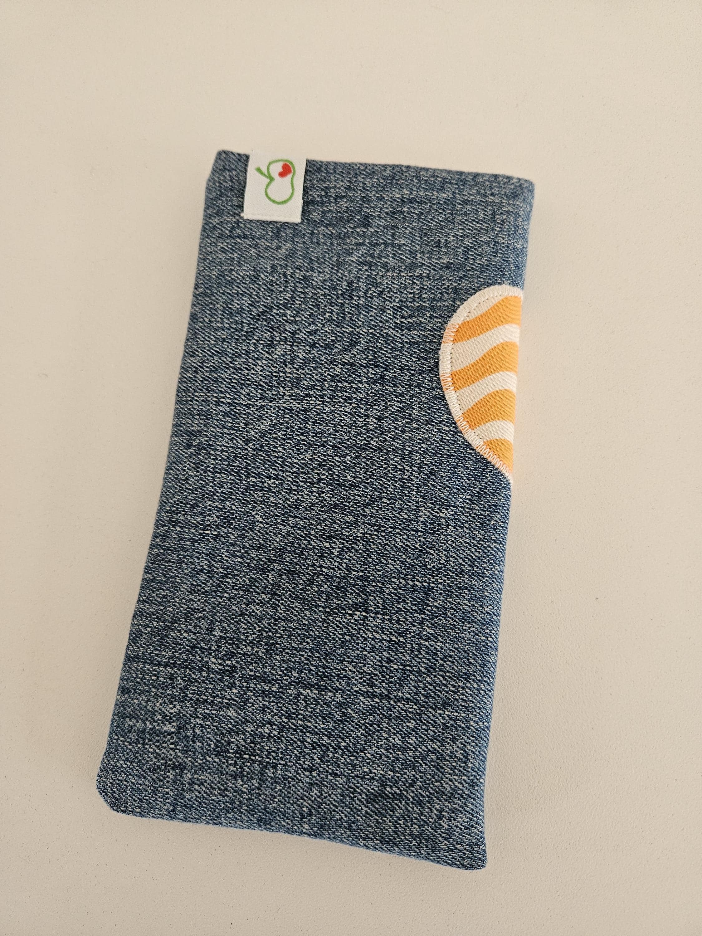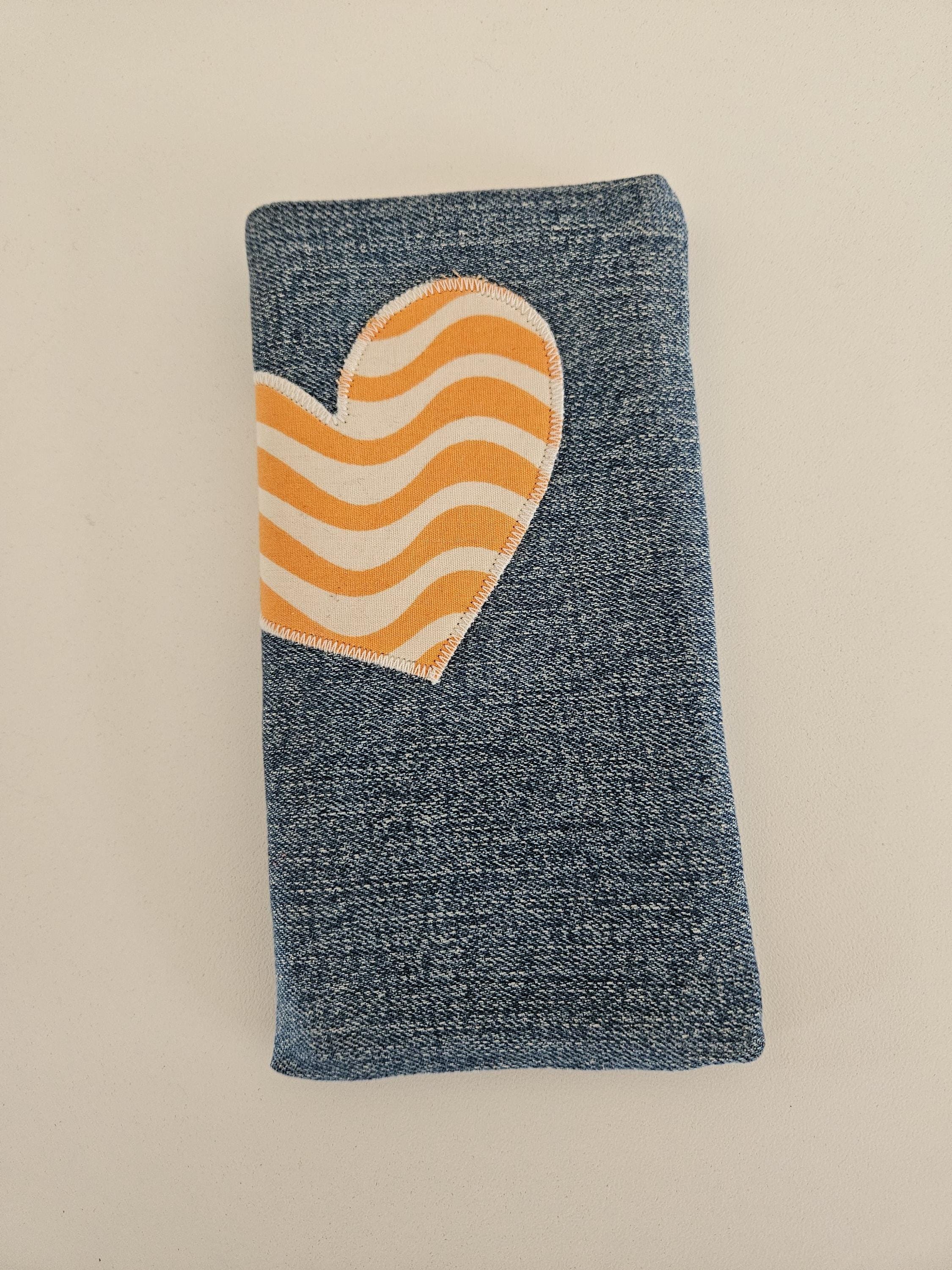 This practical phone case is made of recycled denim in a medium-blue wash with a lovely texture. A real eye-catcher is the sewn-on heart made of organic cotton with a striking wave pattern in orange and natural white. This beautiful new fabric is also used for the lining. To protect your smartphone, the case is lined with soft fleece.