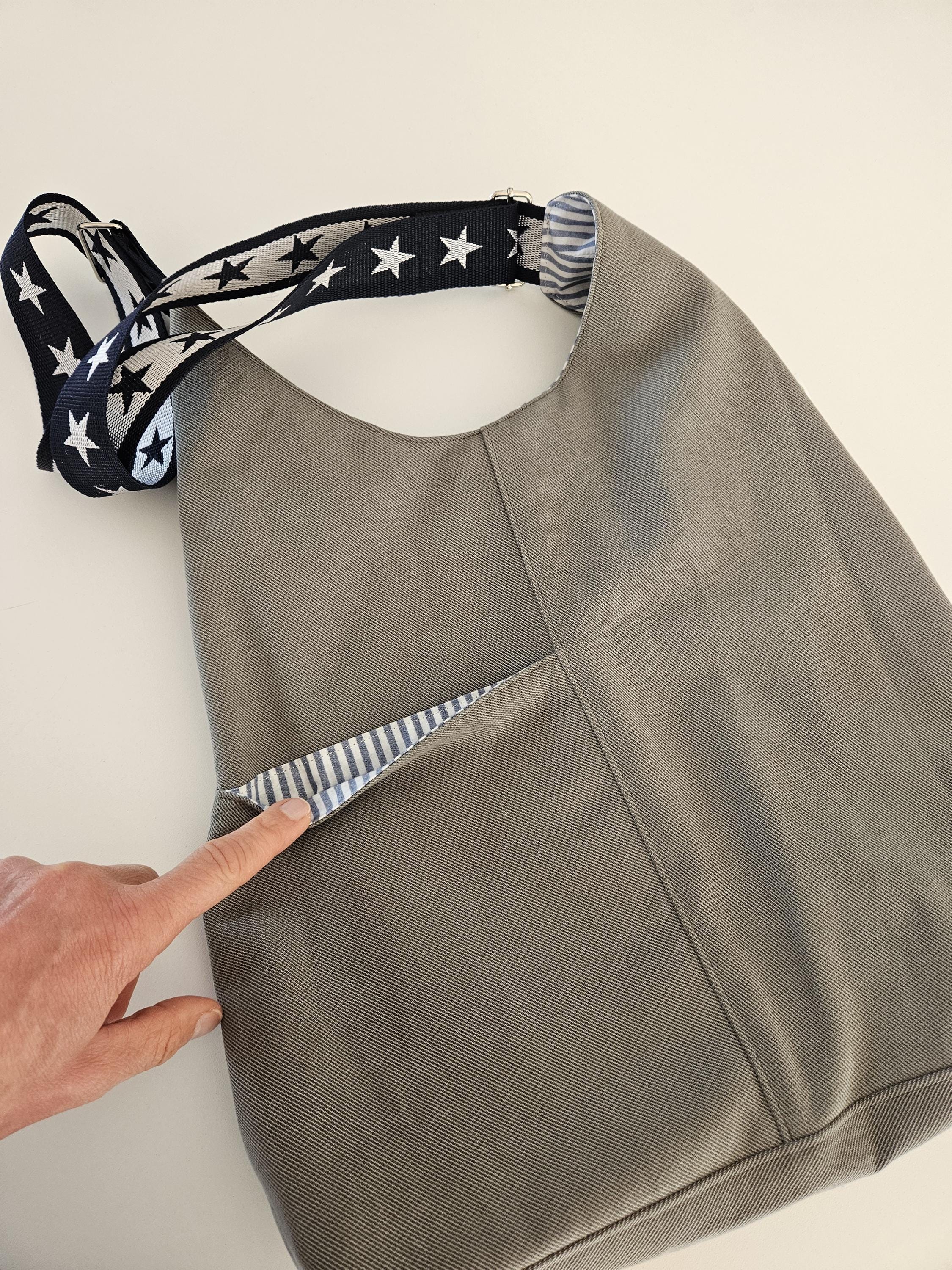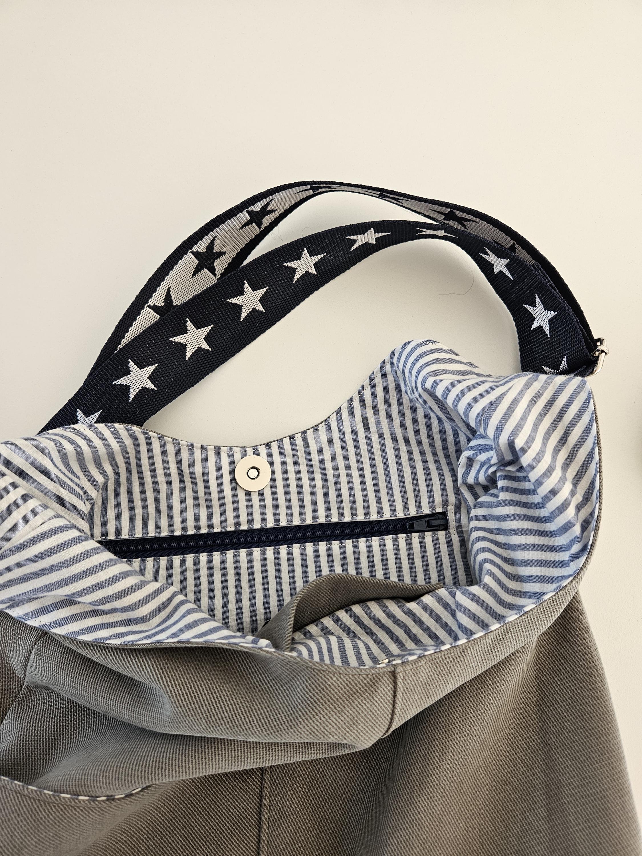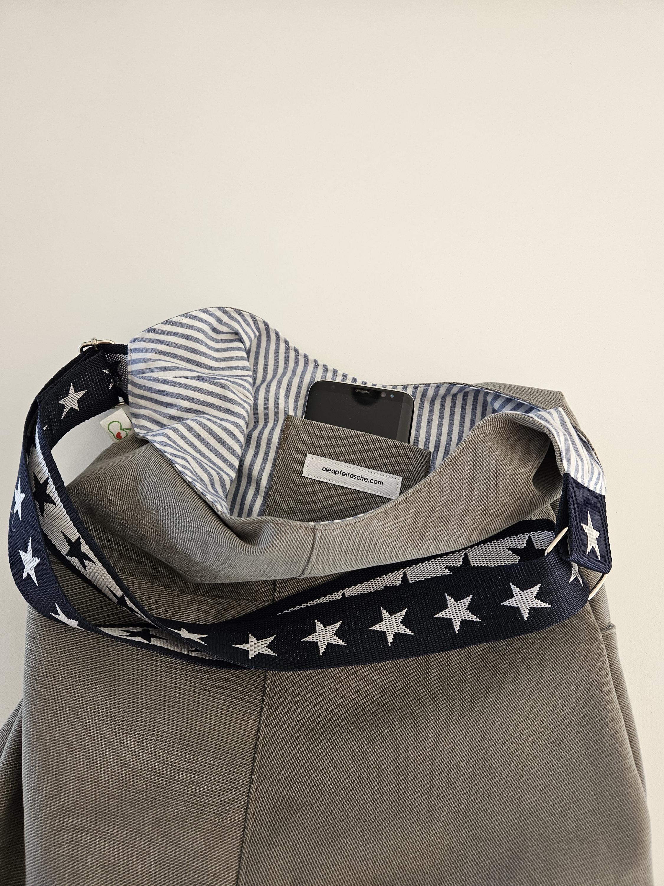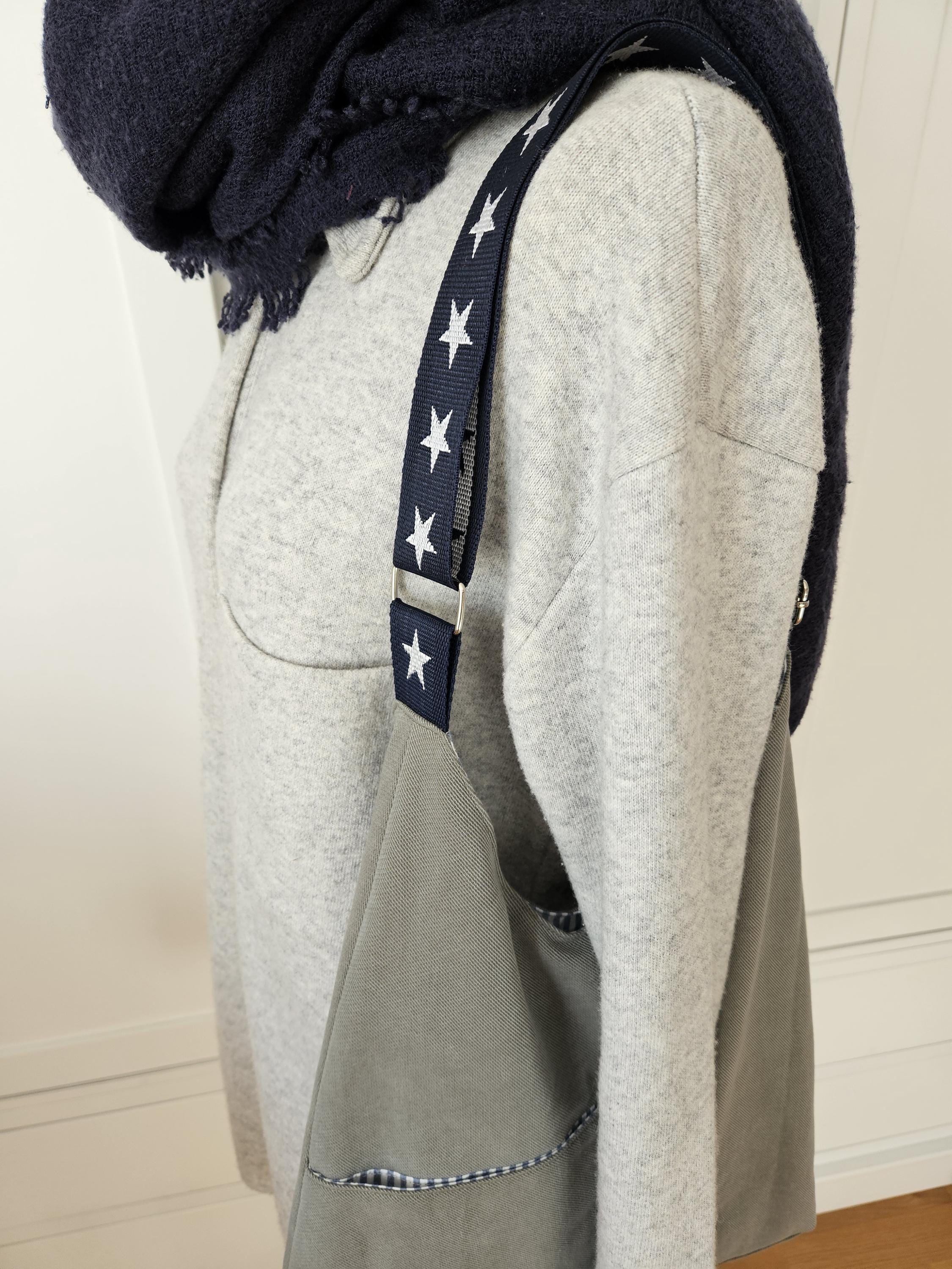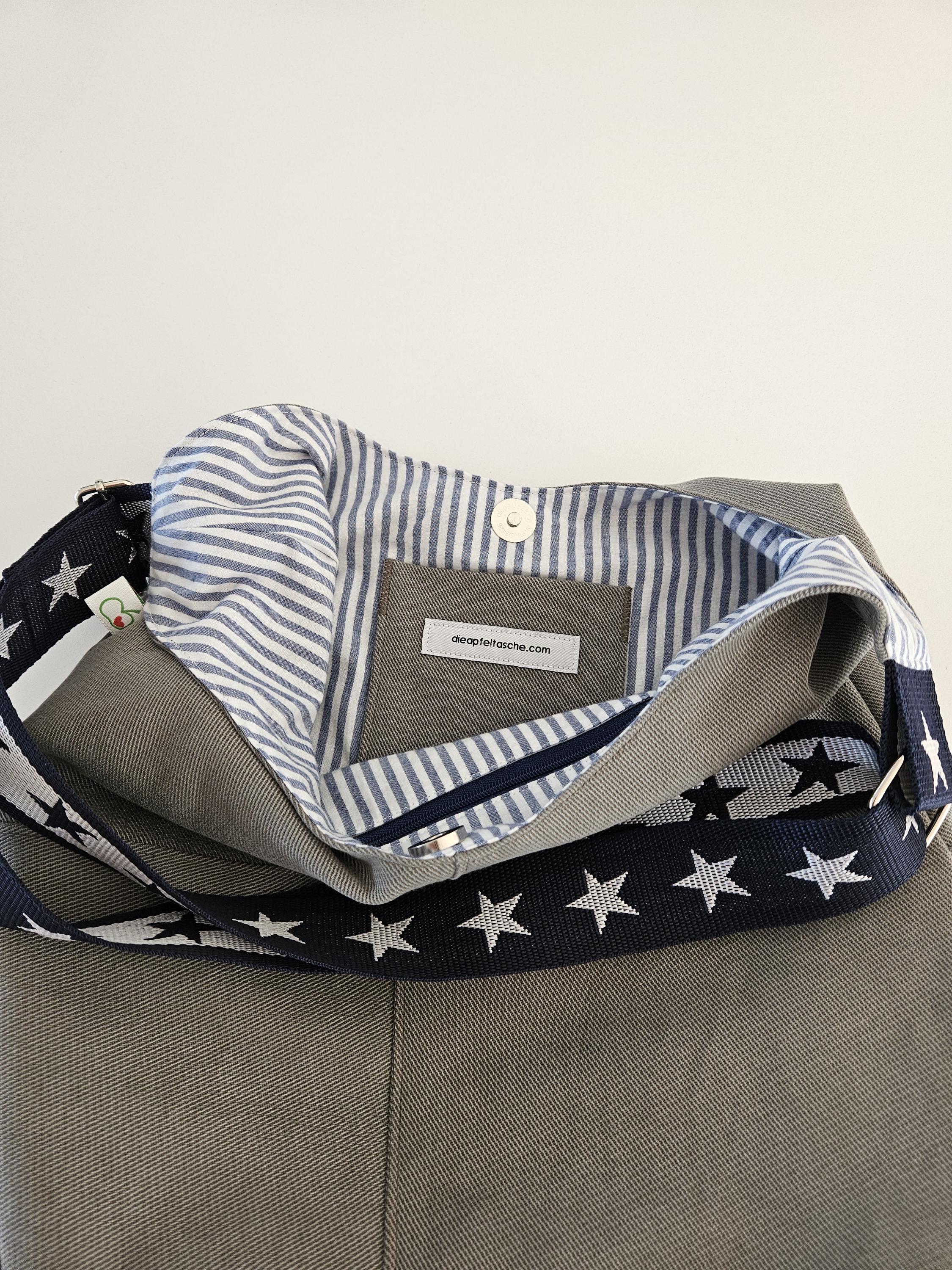This casual shoulder bag with nautical details is the perfect everyday companion for summer. It's made from a wonderfully soft chino fabric in a light sage green and lined with a matching organic cotton fabric featuring a nautical stripe pattern in blue and white. A particularly clever feature is the spacious slip pocket, discreetly sewn into the outer pocket and also lined with the striped fabric. Here you'll always have all your essentials within easy reach. An additional eye-catching detail is the adjustable dark blue shoulder strap with woven white stars.