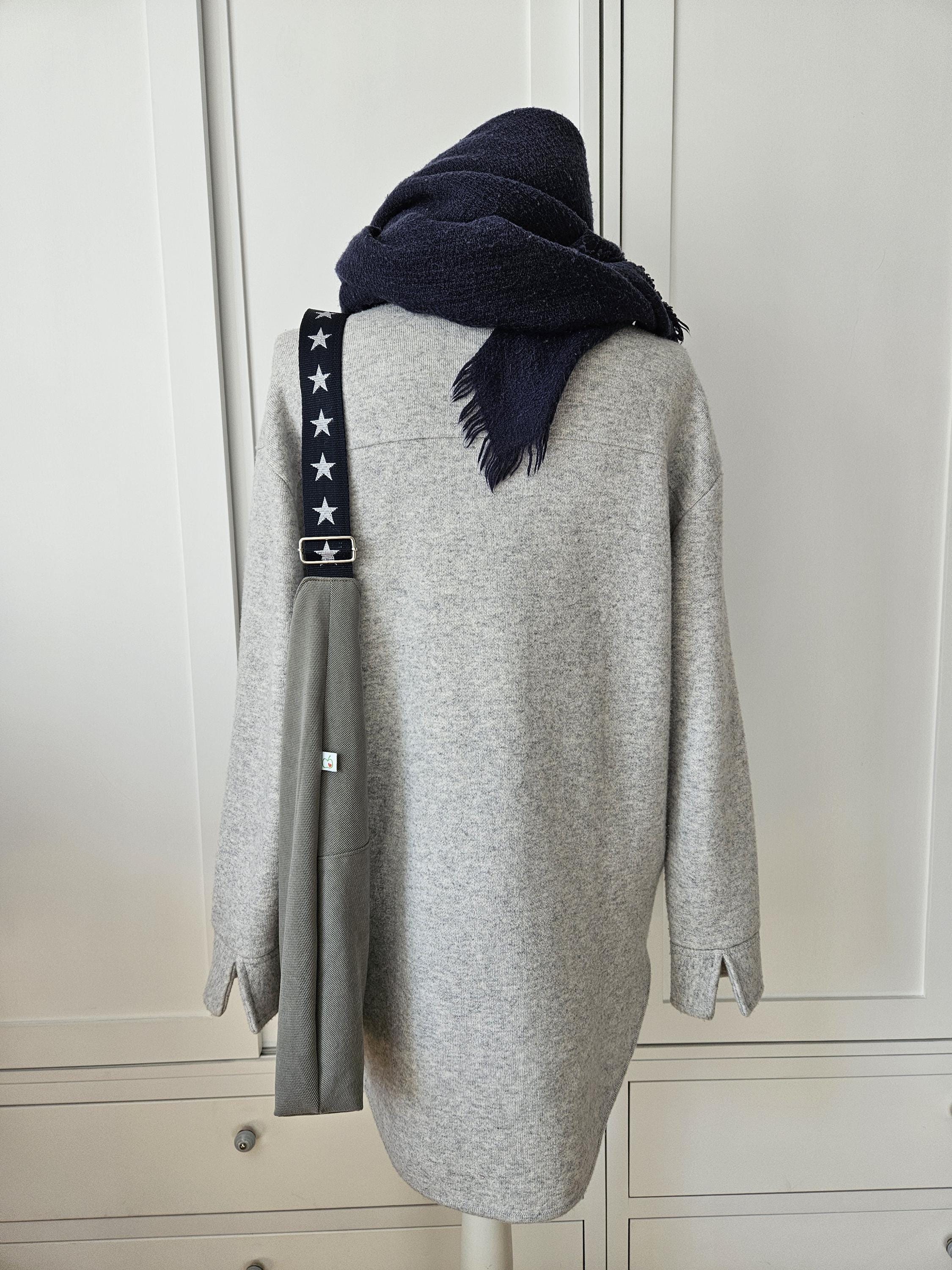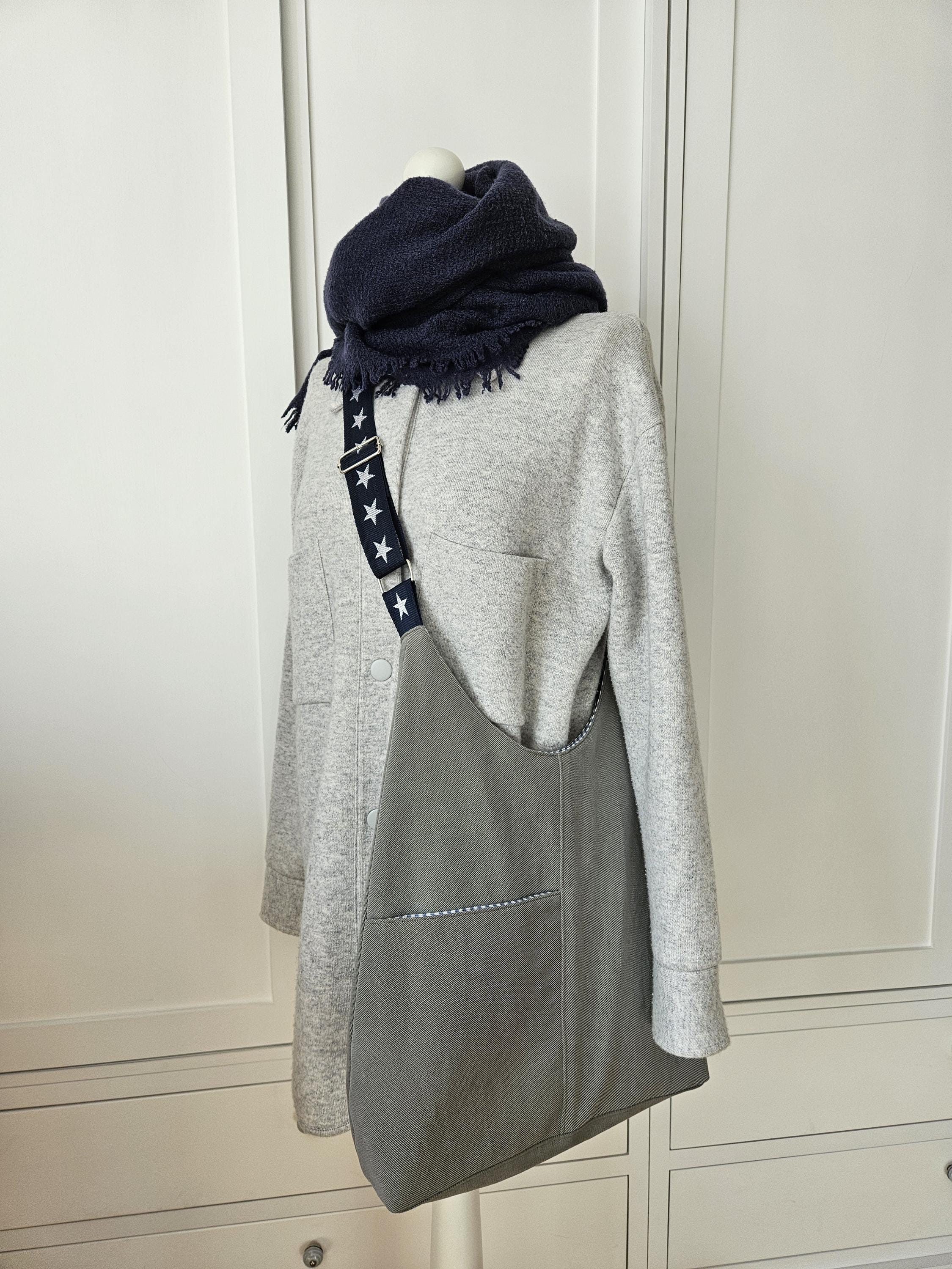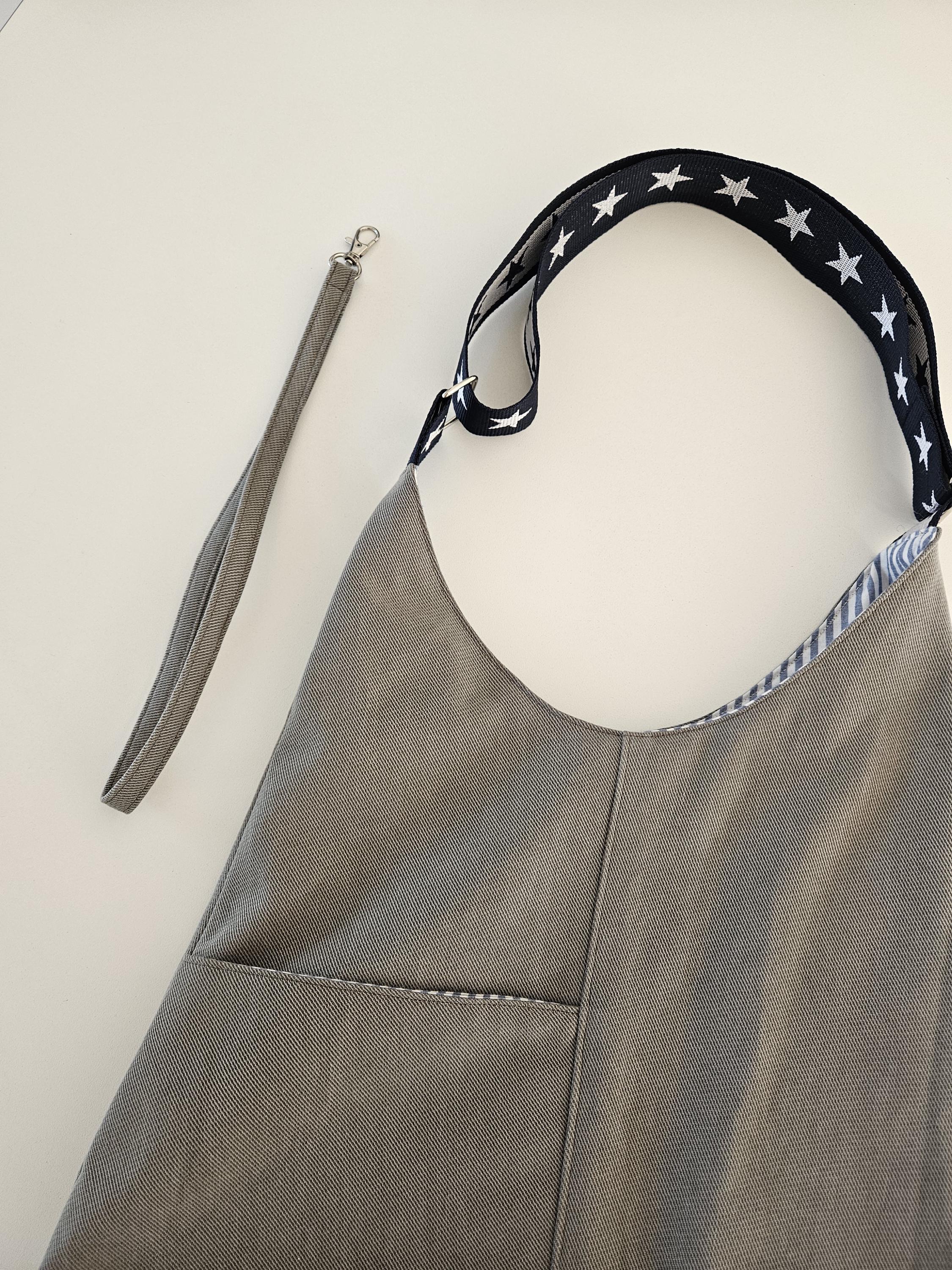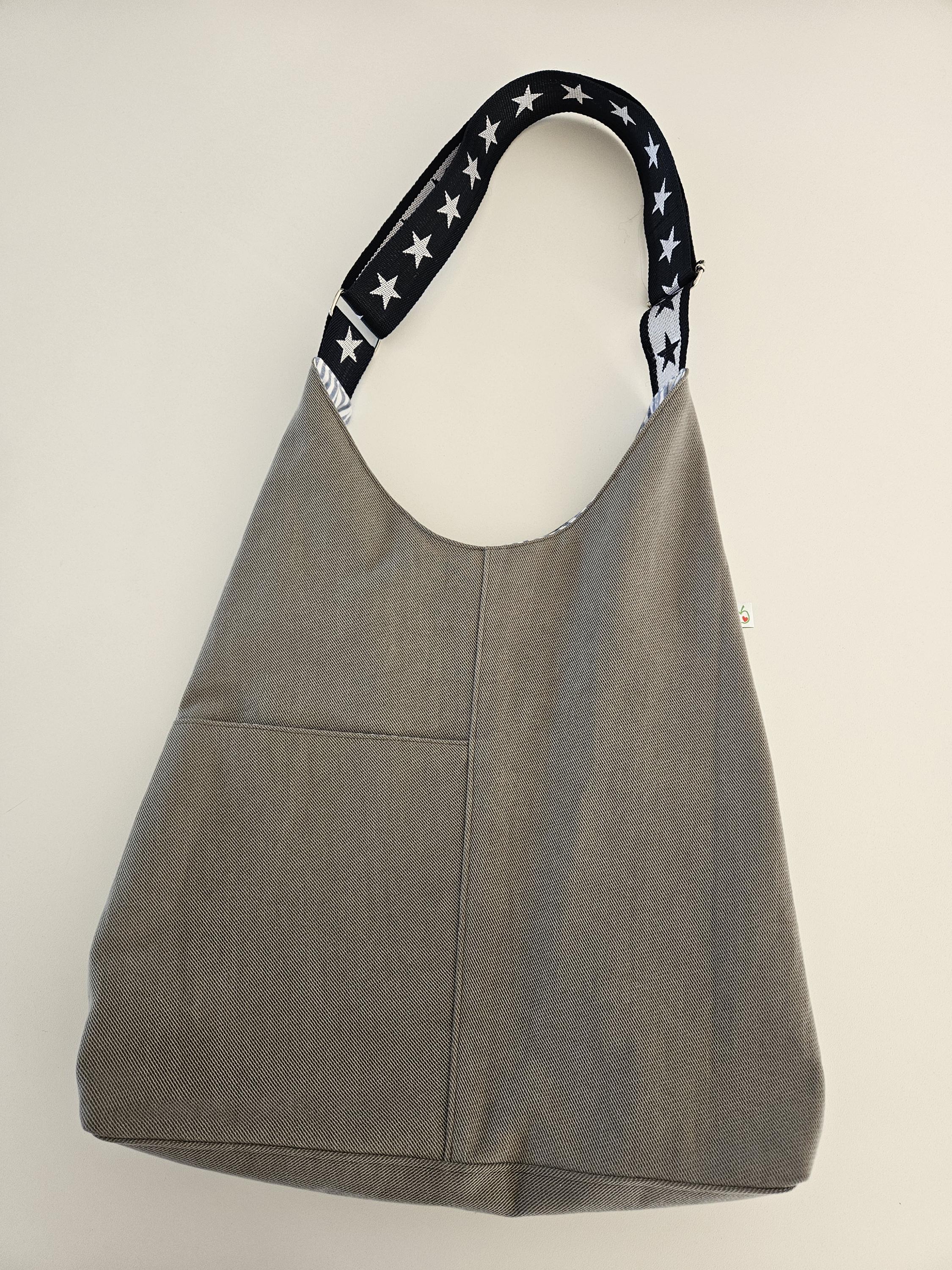 This casual shoulder bag with nautical details is the perfect everyday companion for summer. It's made from a wonderfully soft chino fabric in a light sage green and lined with a matching organic cotton fabric featuring a nautical stripe pattern in blue and white. A particularly clever feature is the spacious slip pocket, discreetly sewn into the outer pocket and also lined with the striped fabric. Here you'll always have all your essentials within easy reach. An additional eye-catching detail is the adjustable dark blue shoulder strap with woven white stars.