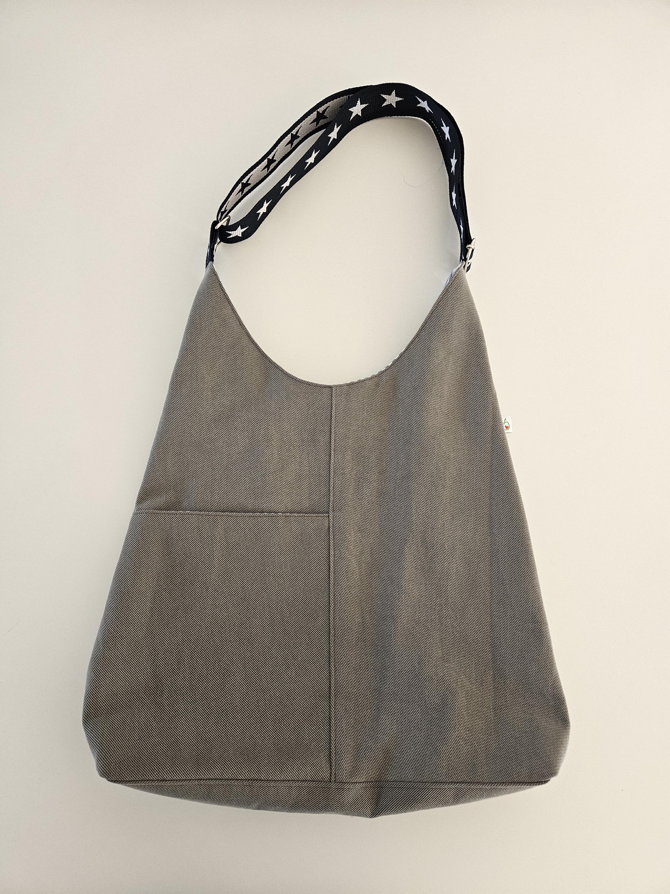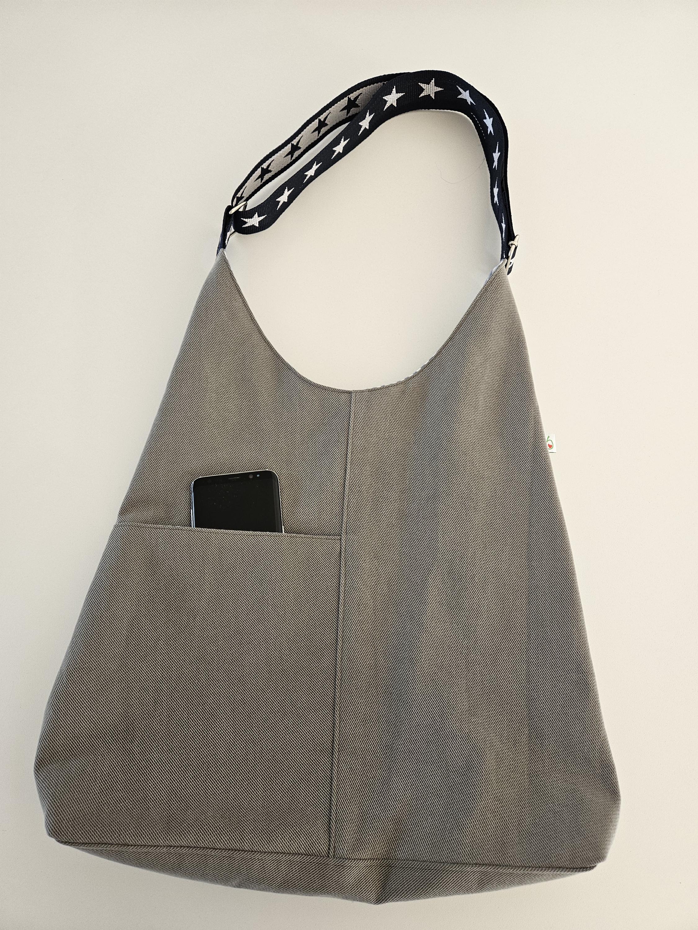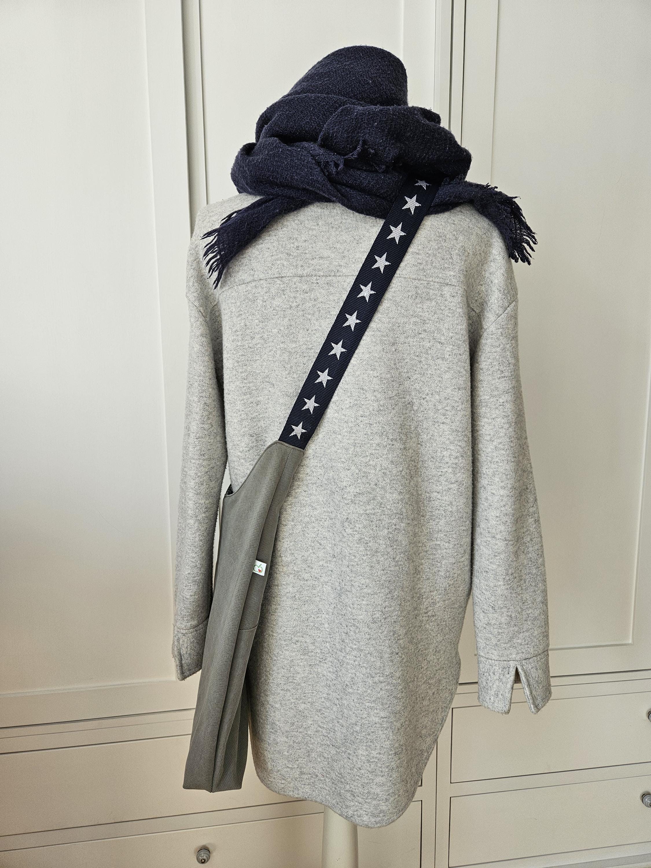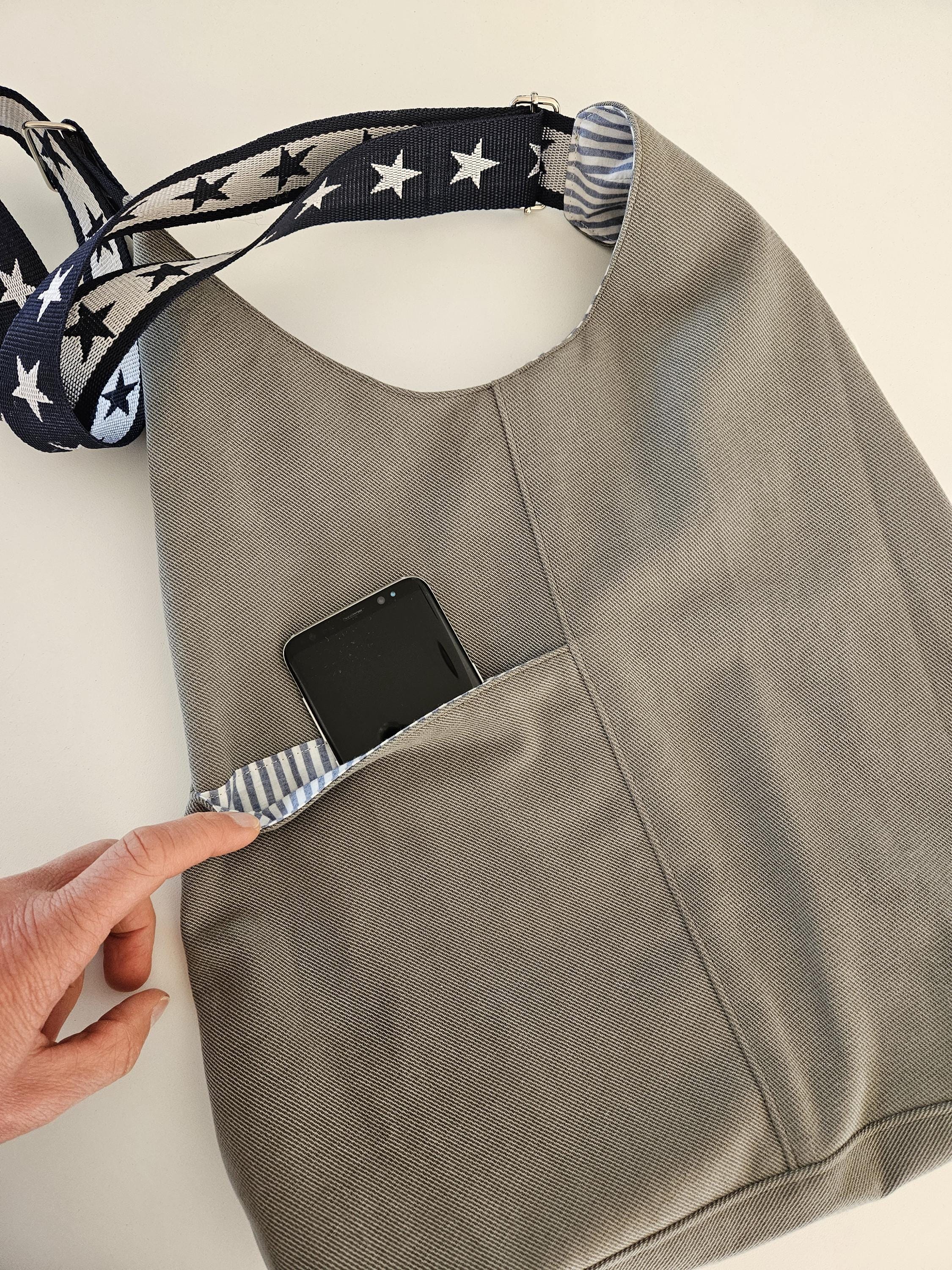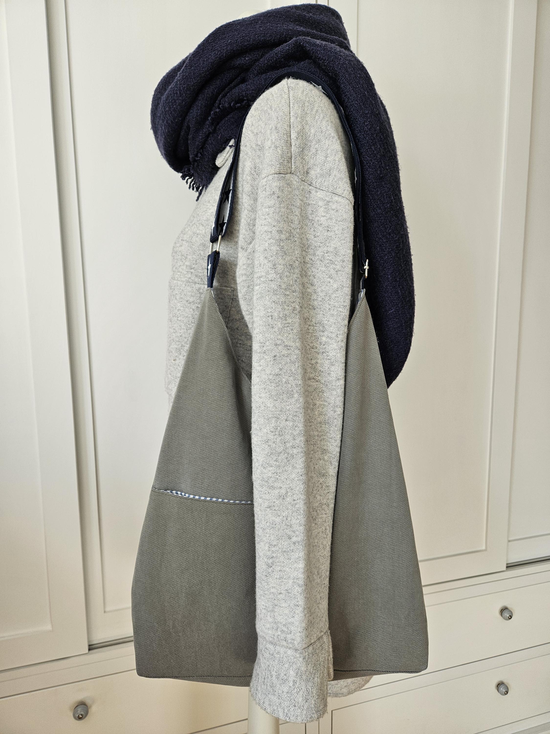This casual shoulder bag with nautical details is the perfect everyday companion for summer. It's made from a wonderfully soft chino fabric in a light sage green and lined with a matching organic cotton fabric featuring a nautical stripe pattern in blue and white. A particularly clever feature is the spacious slip pocket, discreetly sewn into the outer pocket and also lined with the striped fabric. Here you'll always have all your essentials within easy reach. An additional eye-catching detail is the adjustable dark blue shoulder strap with woven white stars.